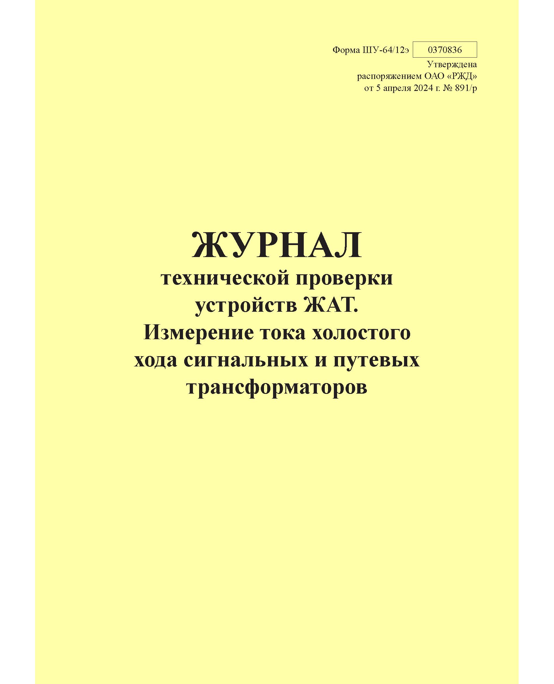 Форма ШУ-64/12э. Журнал технической проверки устройств ЖАТ. Измерение тока холостого хода сигнальных и путевых трансформаторов, утв. Распоряжением ОАО "РЖД" от 05.04.2024 № 891/р (книжный, прошитый, 100 страниц)
