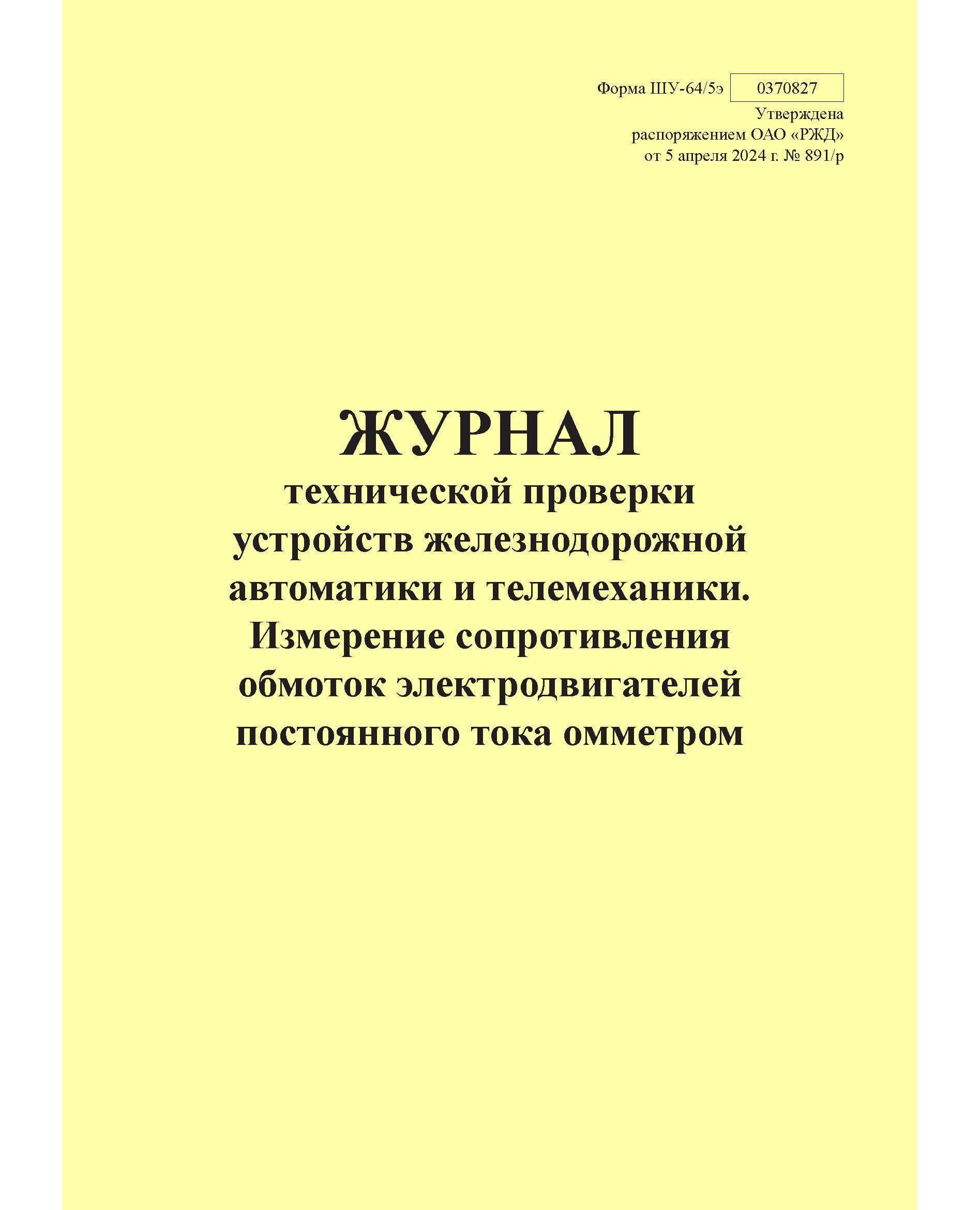 Форма ШУ-64/5э. Журнал технической проверки устройств железнодорожной автоматики и телемеханики. Измерение сопротивления обмоток электродвигателей постоянного тока омметром, утв. Распоряжением ОАО "РЖД" от 05.04.2024 № 891/р (книжный, прошитый, 100 страниц)