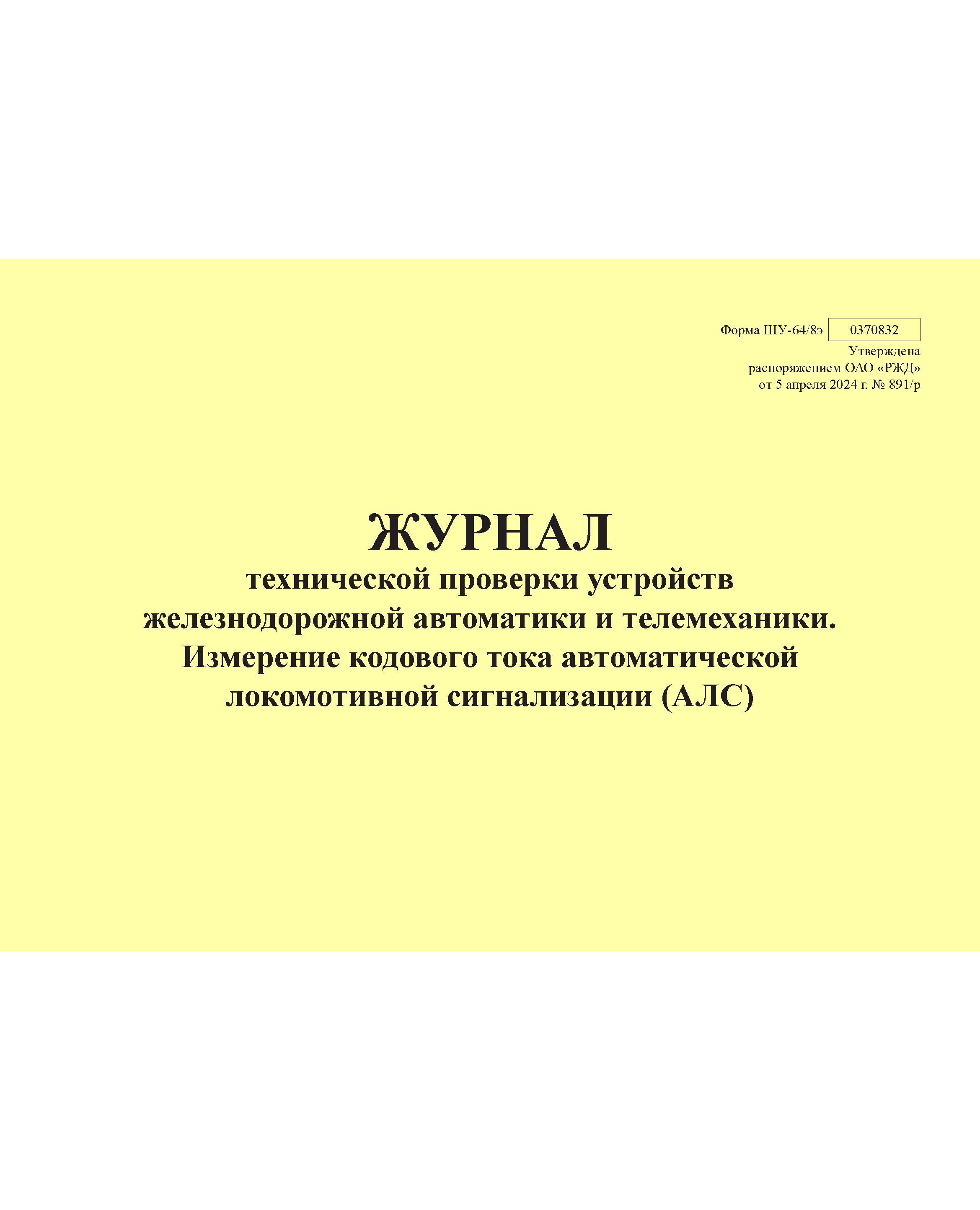 Форма ШУ-64/8э. Журнал технической проверки устройств железнодорожной автоматики и телемеханики. Измерение кодового тока автоматической локомотивной сигнализации (АЛС), утв. Распоряжением ОАО "РЖД" от 05.04.2024 № 891/р (альбомный, прошитый, 100 страниц)