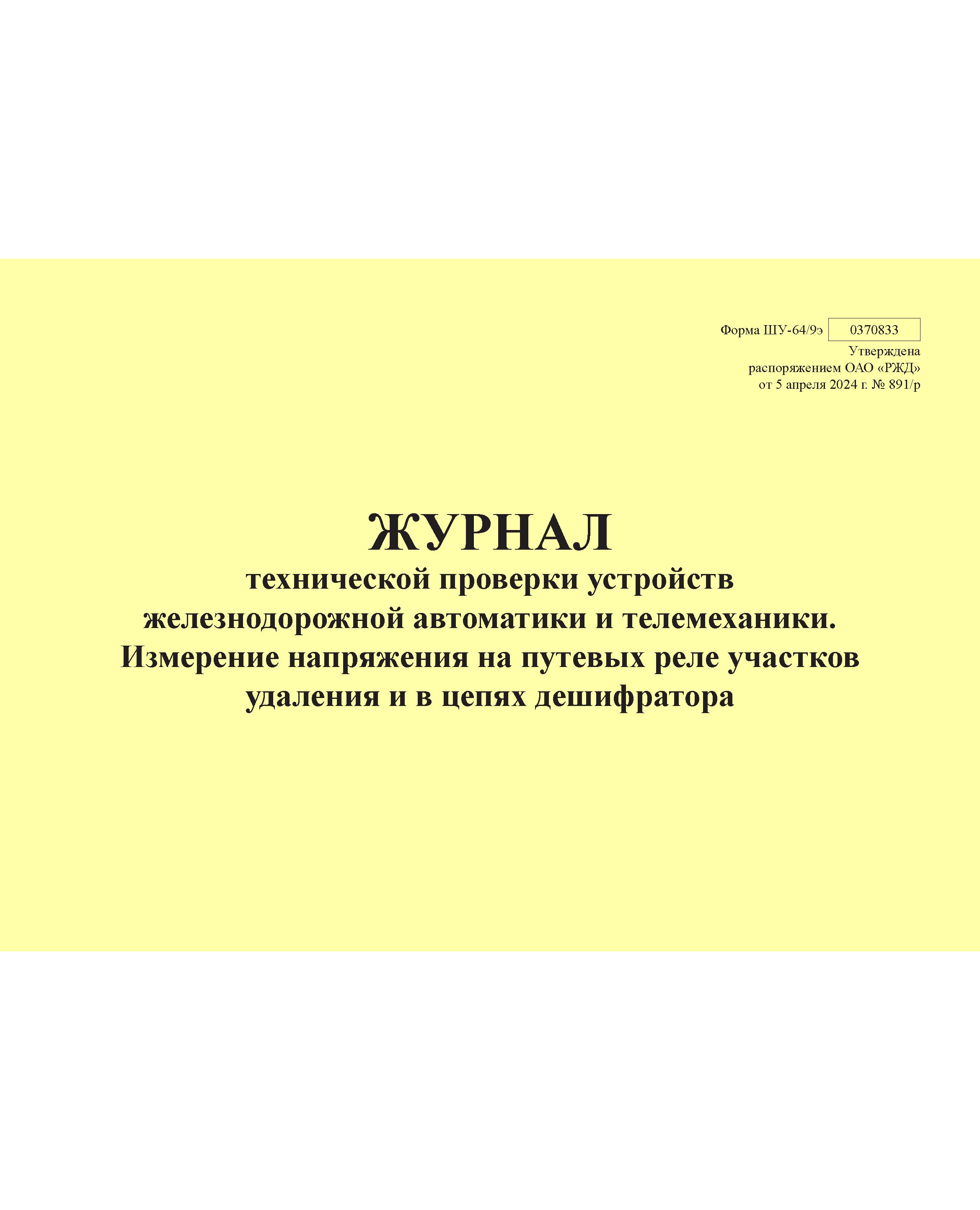 Форма ШУ-64/9э. Журнал технической проверки устройств железнодорожной автоматики и телемеханики. Измерение напряжения на путевых реле участков удаления и в цепях дешифратора, утв. Распоряжением ОАО "РЖД" от 05.04.2024 № 891/р (альбомный, прошитый, 100 страниц)