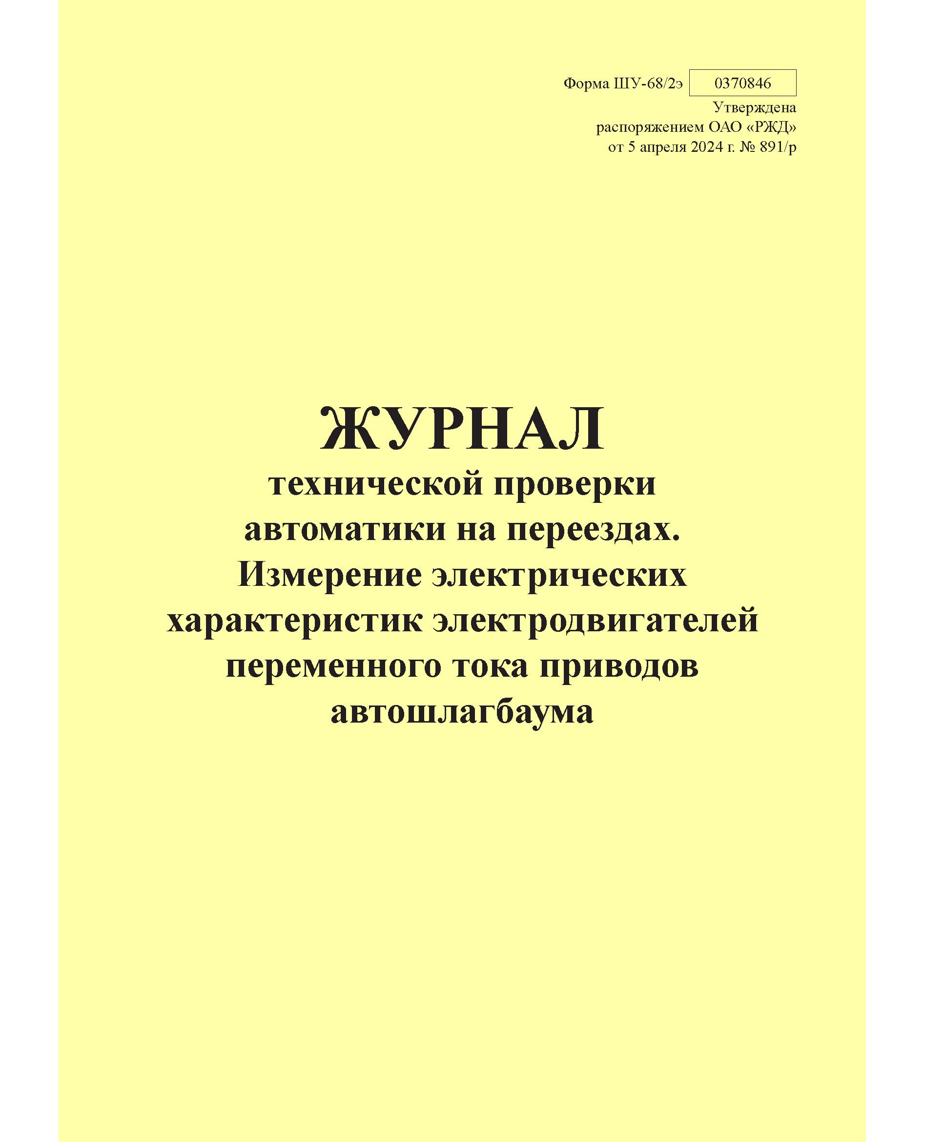 Форма ШУ-68/2э. Журнал технической проверки автоматики на переезде, Измерение электрических характеристик электродвигателей переменного тока приводов автошлагбаума, утв. Распоряжением ОАО "РЖД" от 05.04.2024 № 891/р (книжный, прошитый, 100 страниц)