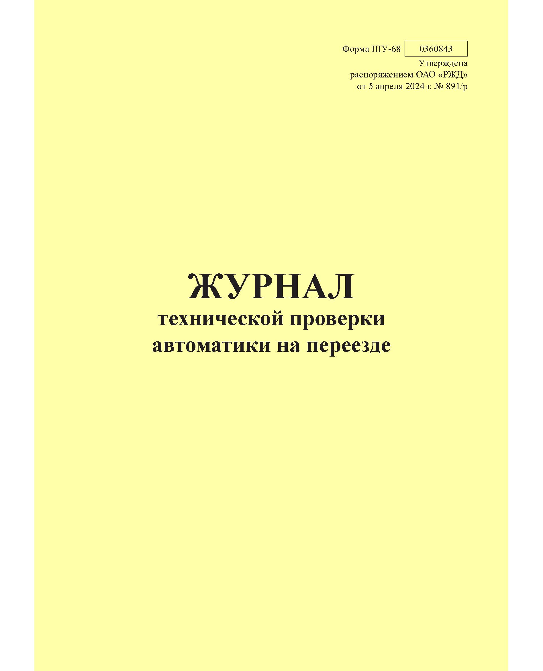 Форма ШУ-68. Журнал технической проверки автоматики на переезде, утв. Распоряжением ОАО "РЖД" от 05.04.2024 № 891/р (книжный, прошитый, 100 страниц)