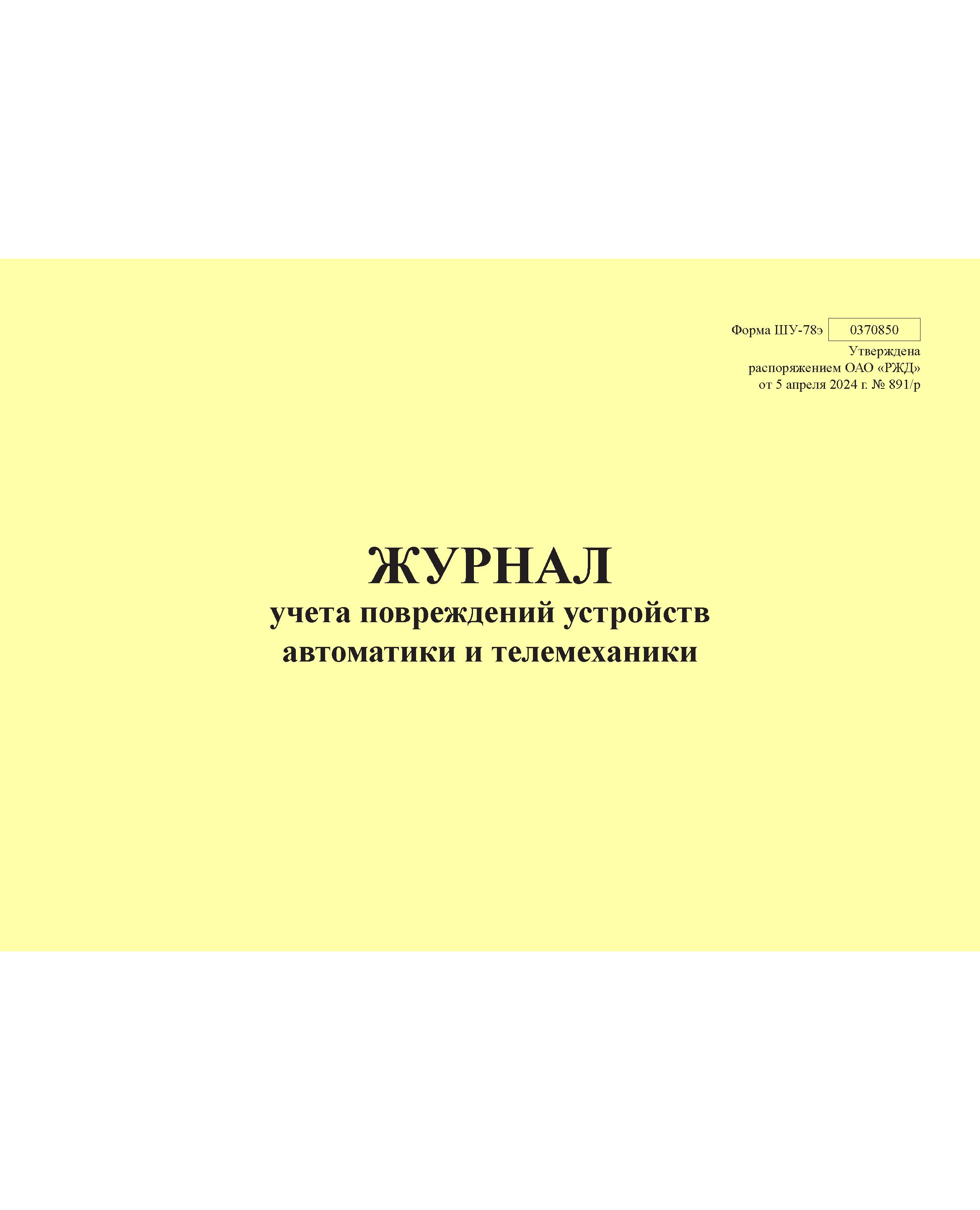 Форма ШУ-78э. Журнал учета повреждений устройств автоматики и телемеханики, утв. Распоряжением ОАО "РЖД" от 05.04.2024 № 891/р (альбомный, прошитый, 100 страниц)