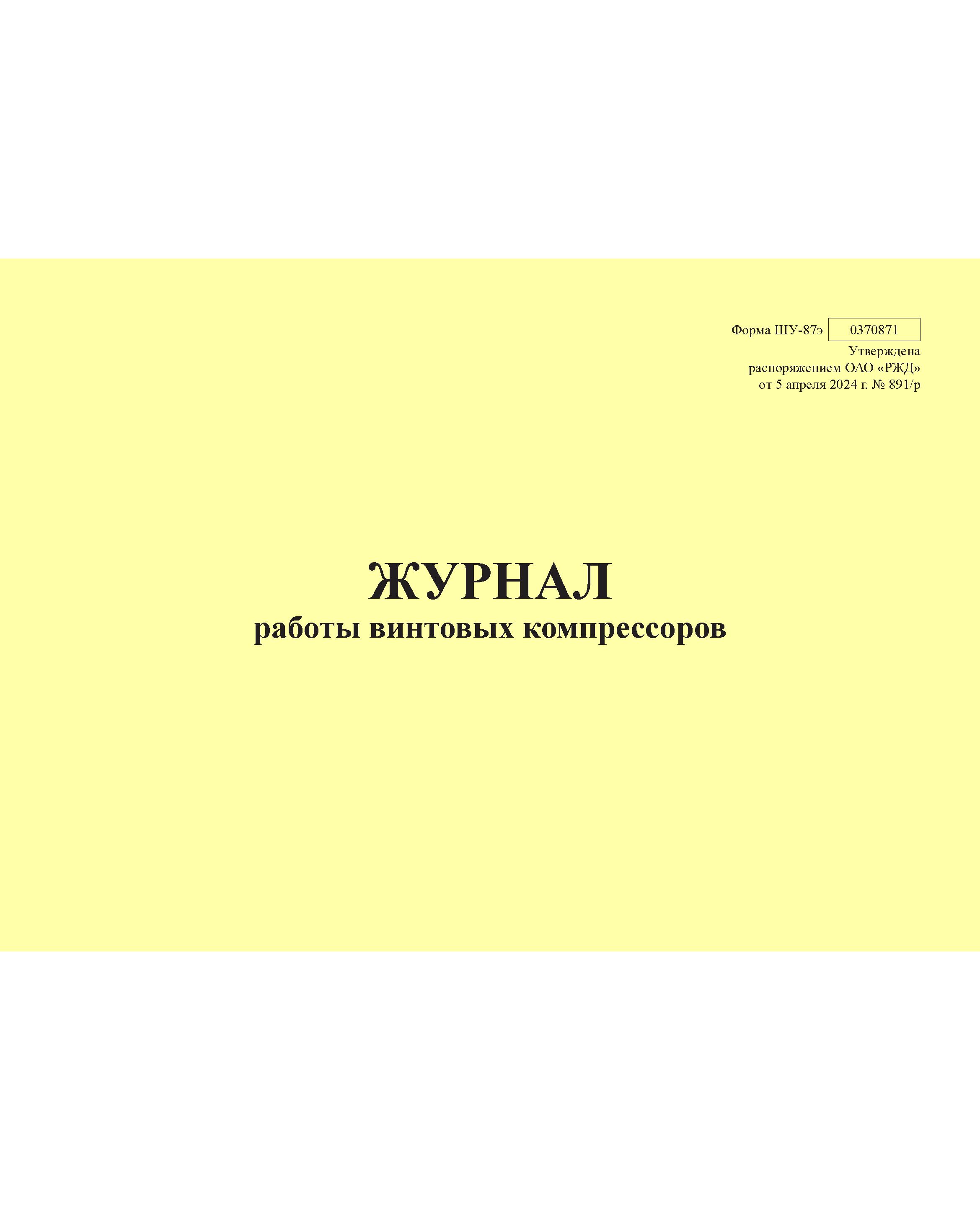Форма ШУ-87э. Журнал работы винтовых компрессоров, утв. Распоряжением ОАО "РЖД" от 05.04.2024 № 891/р (альбомный, прошитый, 100 страниц)