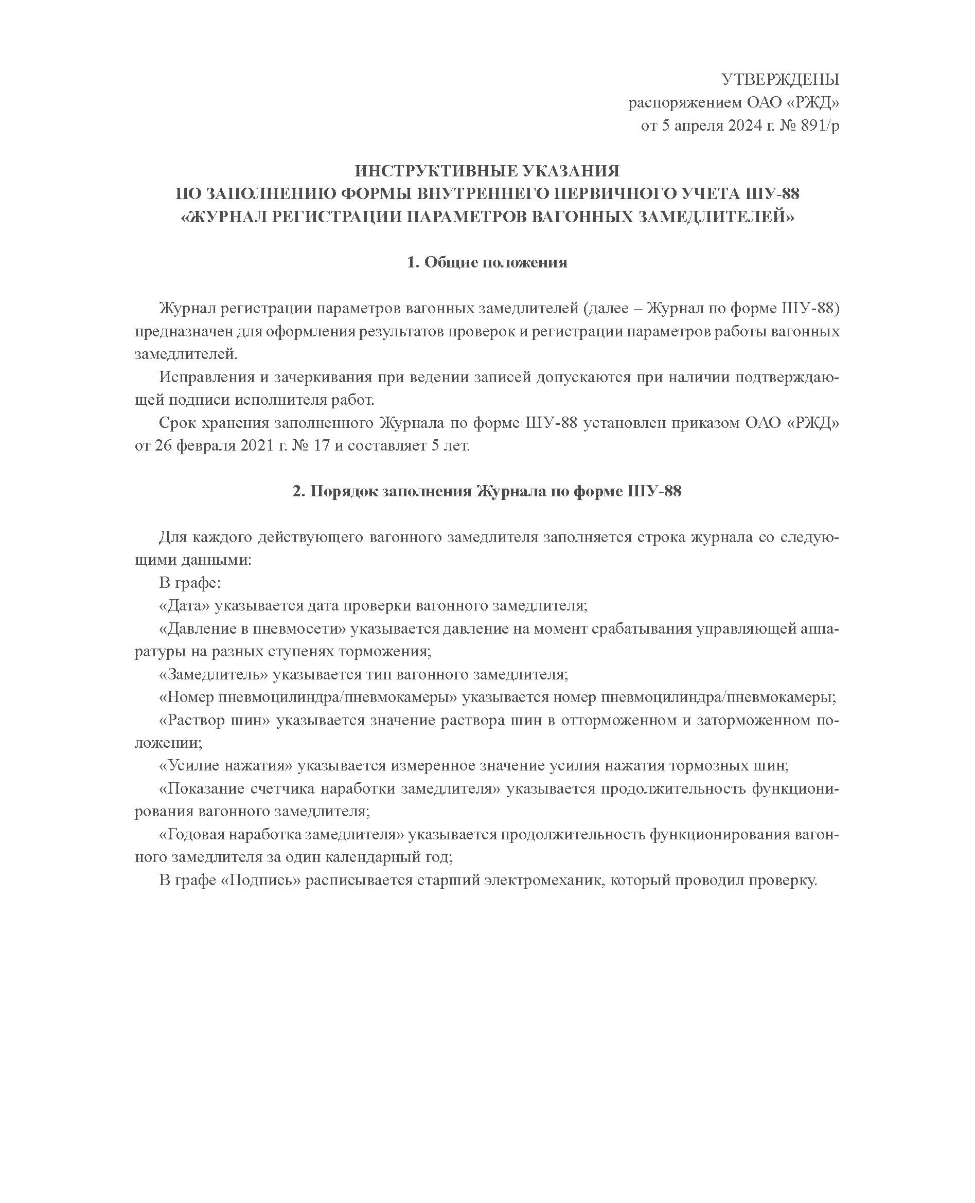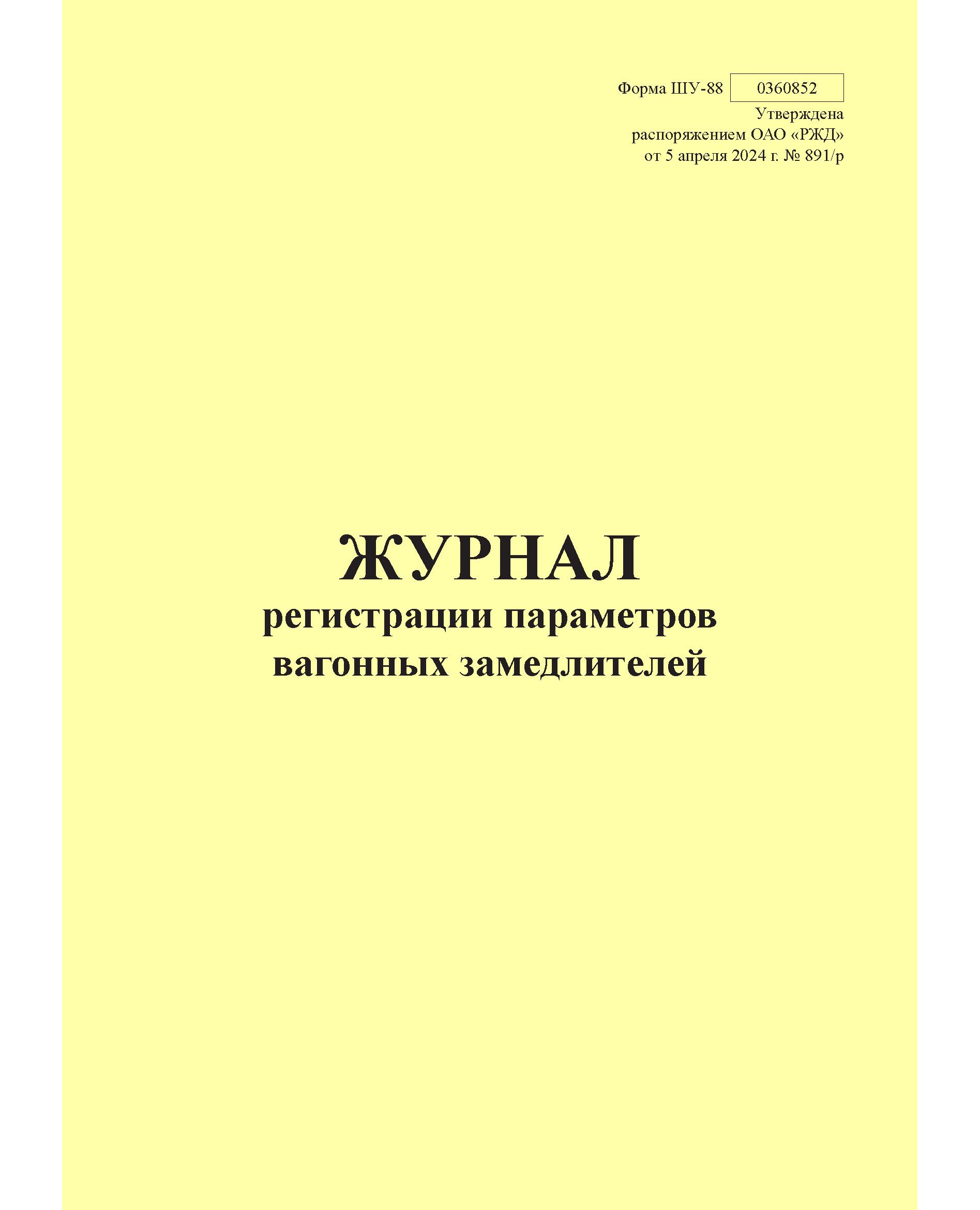 Форма ШУ-88. Журнал регистрации параметров вагонных замедлителей, утв. Распоряжением ОАО "РЖД" от 05.04.2024 № 891/р (книжный, прошитый, 100 страниц)
