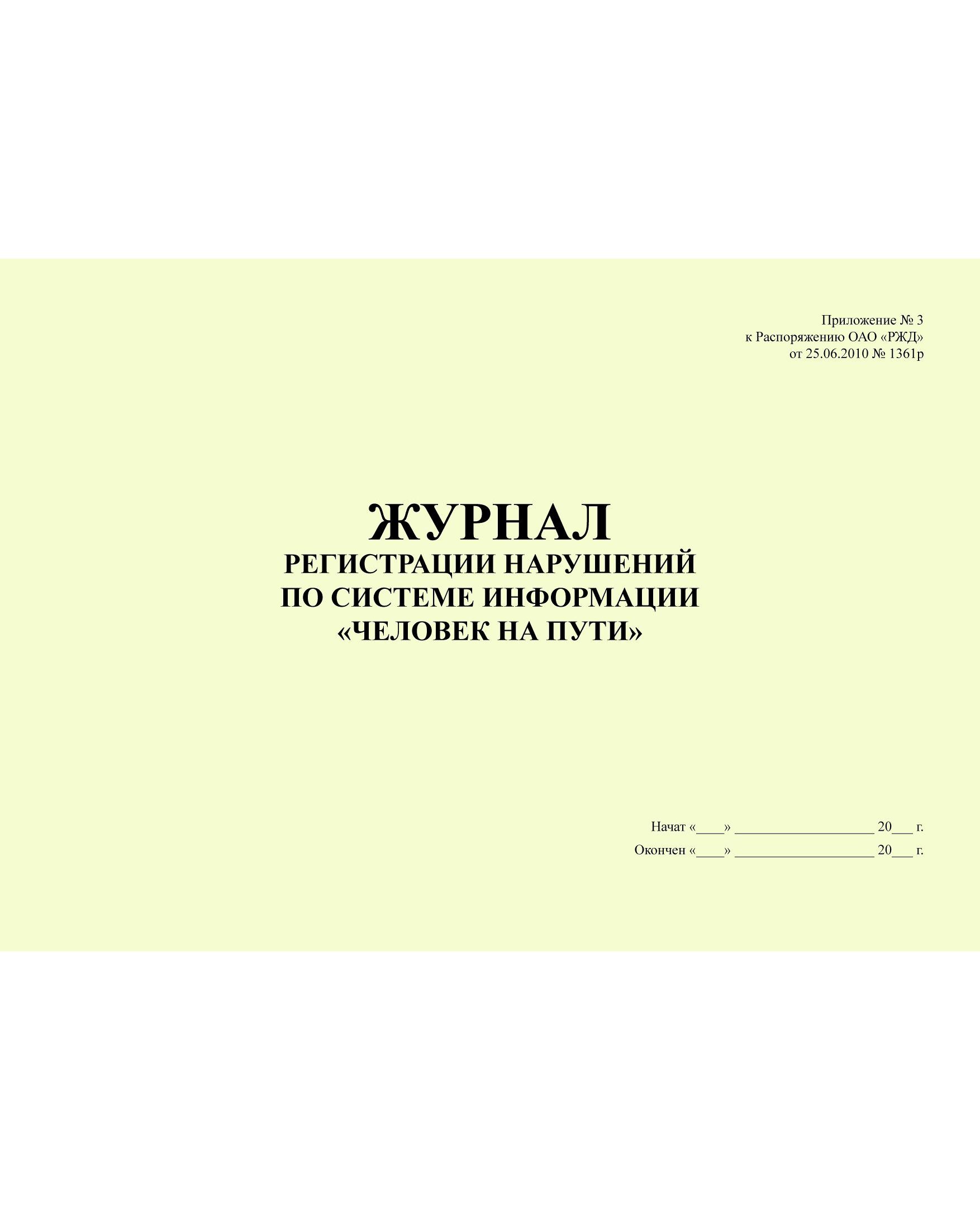 Журнал регистрации переданных нарушений по системе информации "Человек на пути". Приложение № 2 к Распоряжению ОАО "РЖД" от 14.12.2022 № 3308/р. альбомный, 100 страниц, прошит