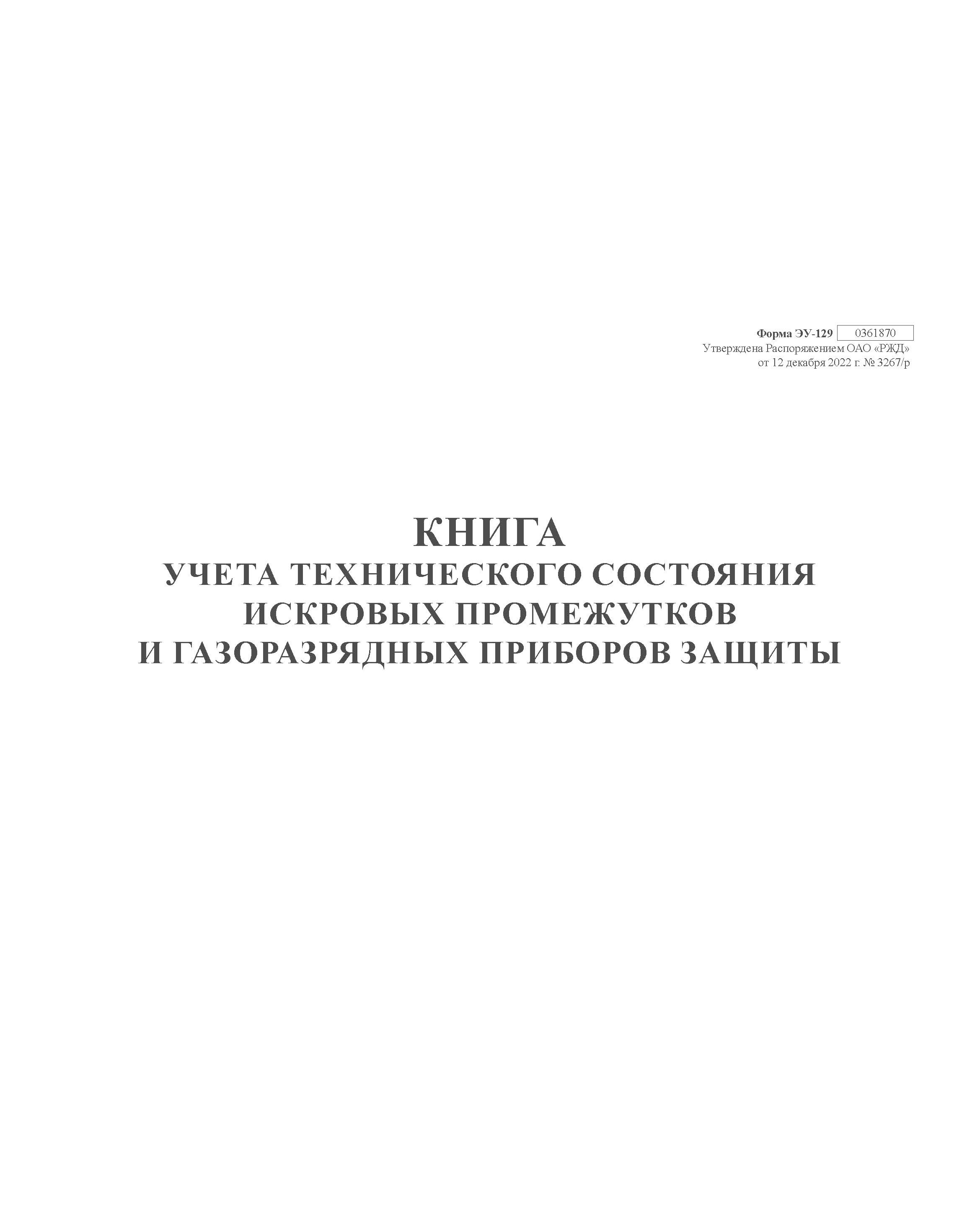 Книга учета технического состояния искровых промежутков и газоразрядных приборов защиты. Форма внутреннего первичного учета ЭУ-129, утв. Распоряжением ОАО "РЖД" от 12.12.2022 № 3267/р. альбомный, прошитый, 100 страниц