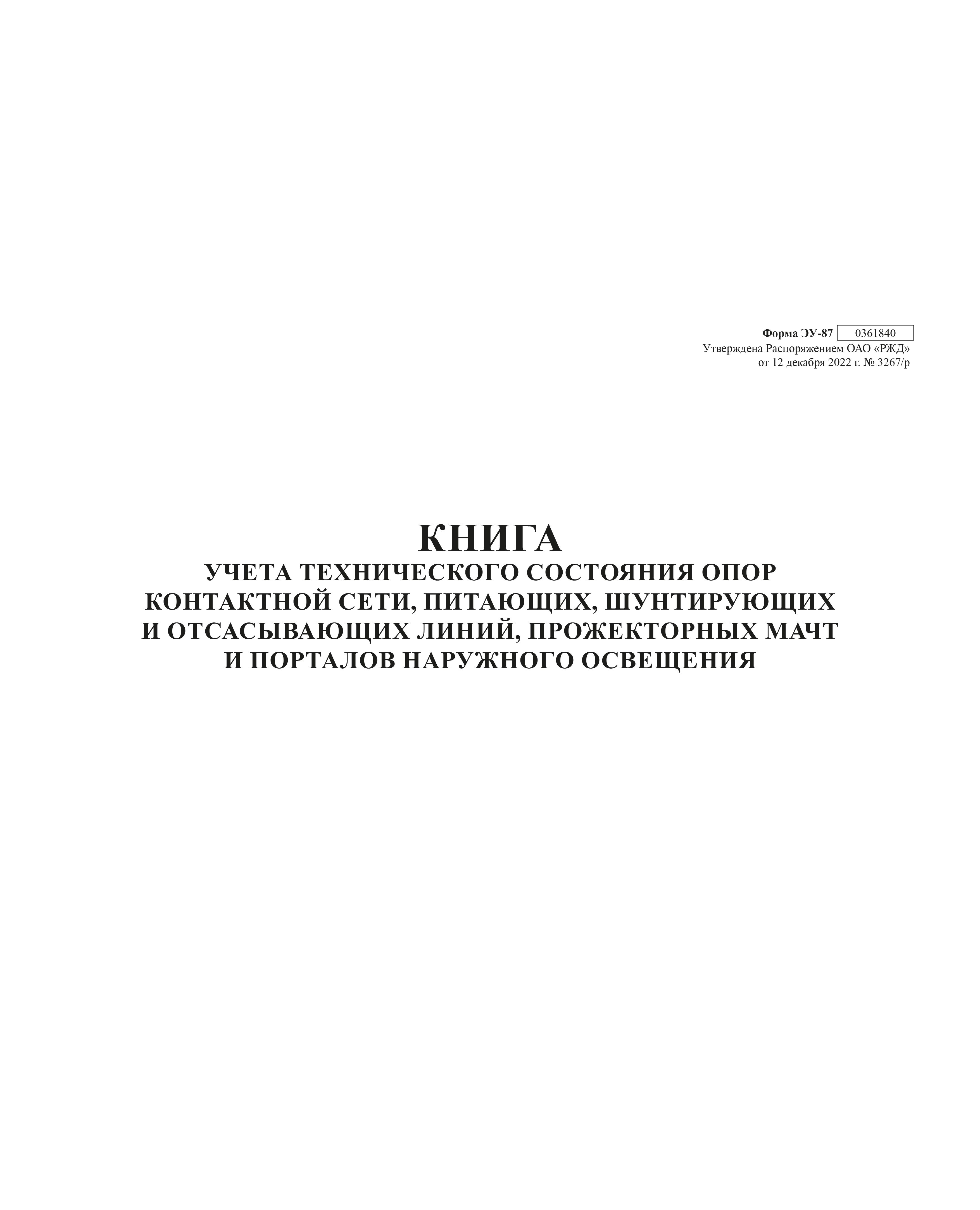 Книга учета технического состояния опор контактной сети, питающих, шунтирующих и отсасывающих линий, прожекторных мачт и порталов наружного освещения. Форма внутреннего первичного учета ЭУ-87, утв. Распоряжением ОАО "РЖД" от 12.12.2022 № 3267/р. альбомный, прошитый, 100 страниц
