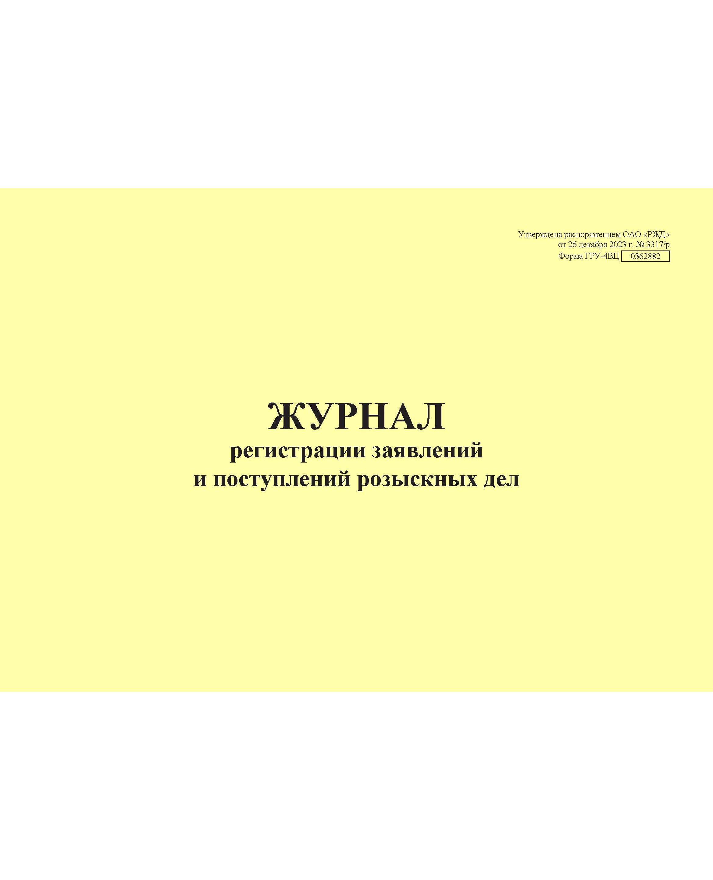 Форма ГРУ-4ВЦ. Журнал регистрации заявлений и поступлений розыскных дел. Утверждена распоряжением ОАО "РЖД" от 26 декабря 2023 г. № 3317/р (прошитый, 100 страниц)