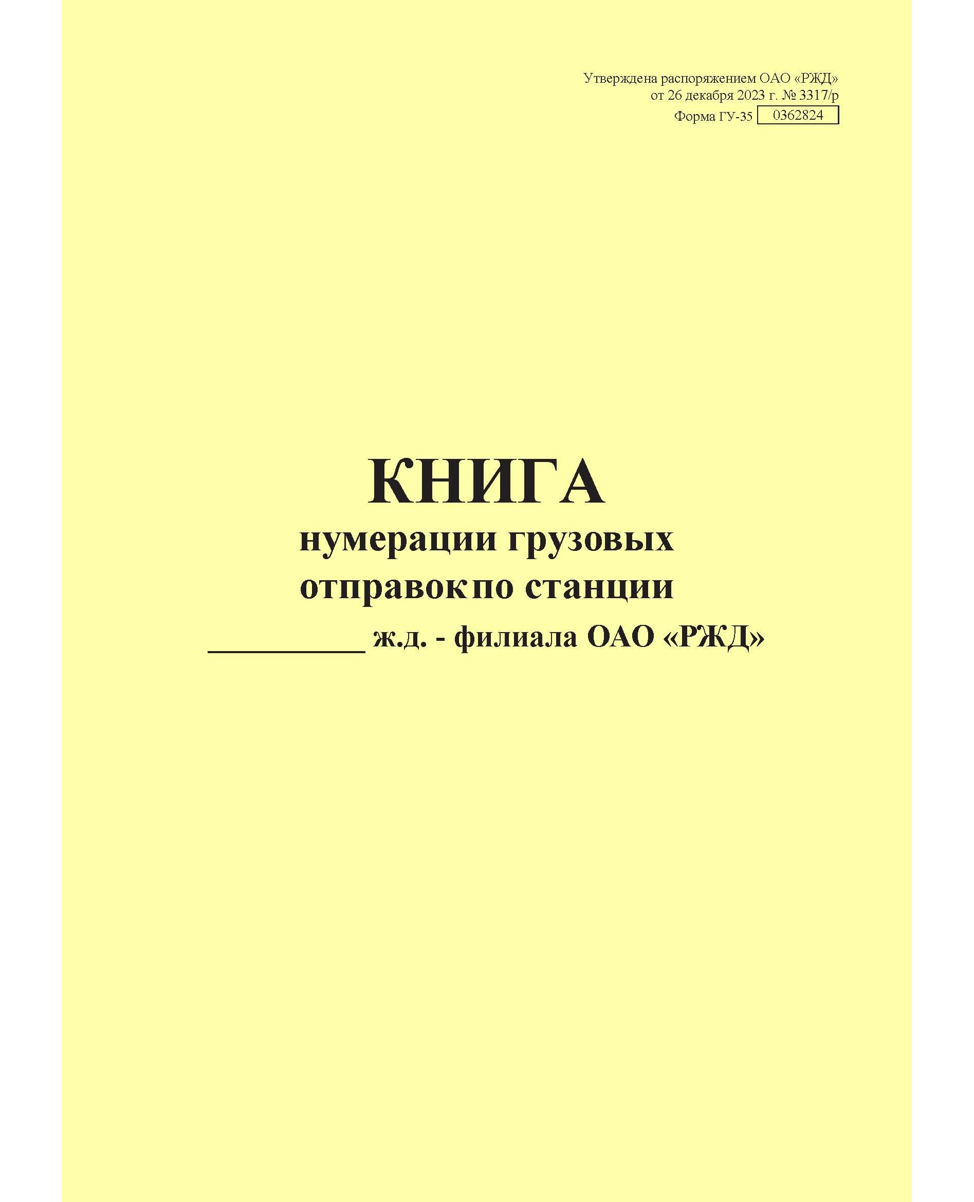 Форма ГУ-35. Книга нумерации грузовых отправок по станции. Утверждена распоряжением ОАО "РЖД" от 26 декабря 2023 г. № 3317/р (прошитый, 100 страниц)