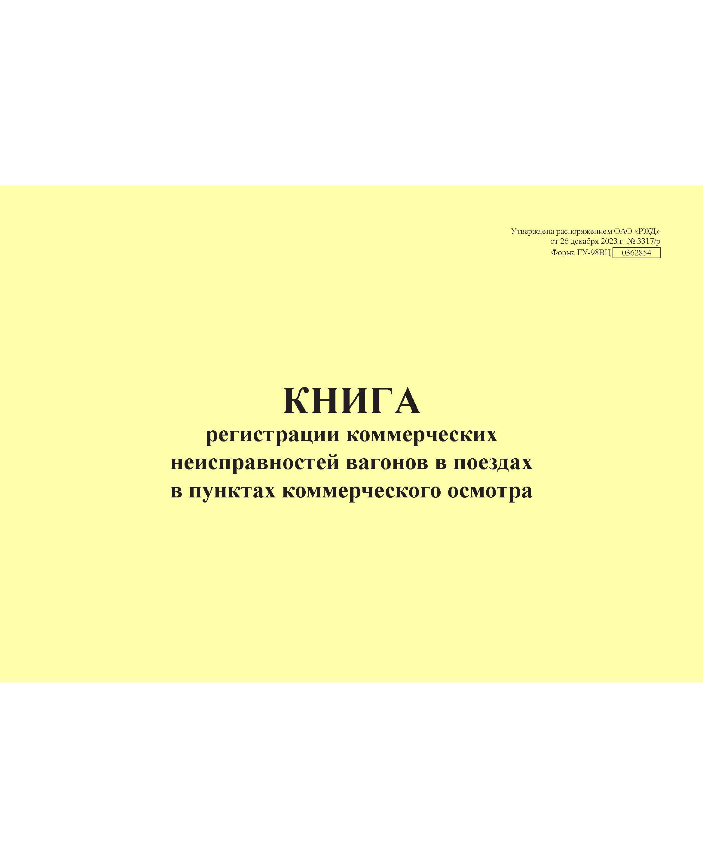 Форма ГУ-98ВЦ. Книга регистрации коммерческих неисправностей вагонов в поездах в пунктах коммерческого осмотра. Утверждена распоряжением ОАО "РЖД" от 26 декабря 2023 г. № 3317/р (прошитый, 100 страниц)