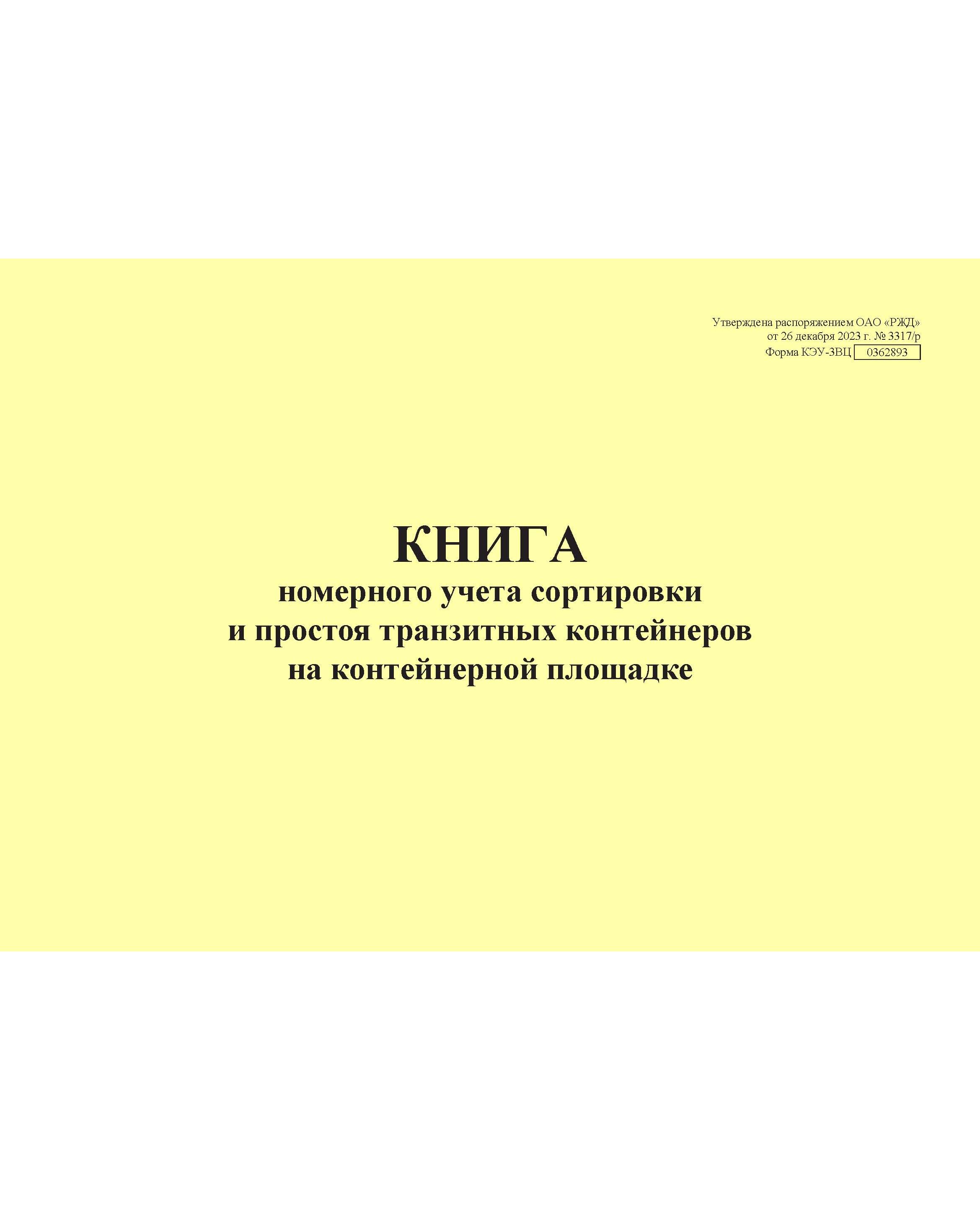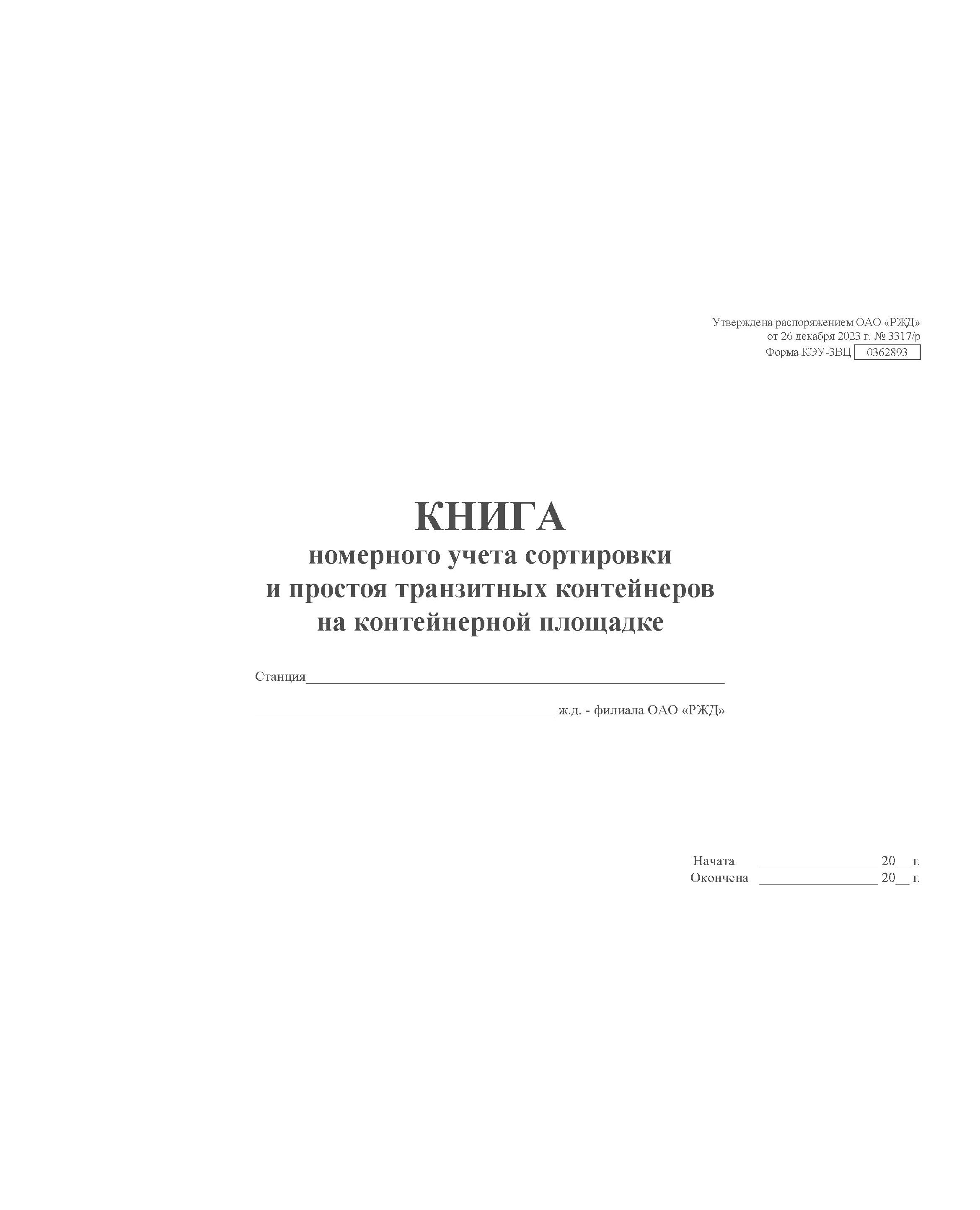 Форма КЭУ-3ВЦ. Книга номерного учета сортировки и простоя транзитных контейнеров на контейнерной площадке . Утверждена распоряжением ОАО "РЖД" от 26 декабря 2023 г. № 3317/р (прошитый, 100 страниц)