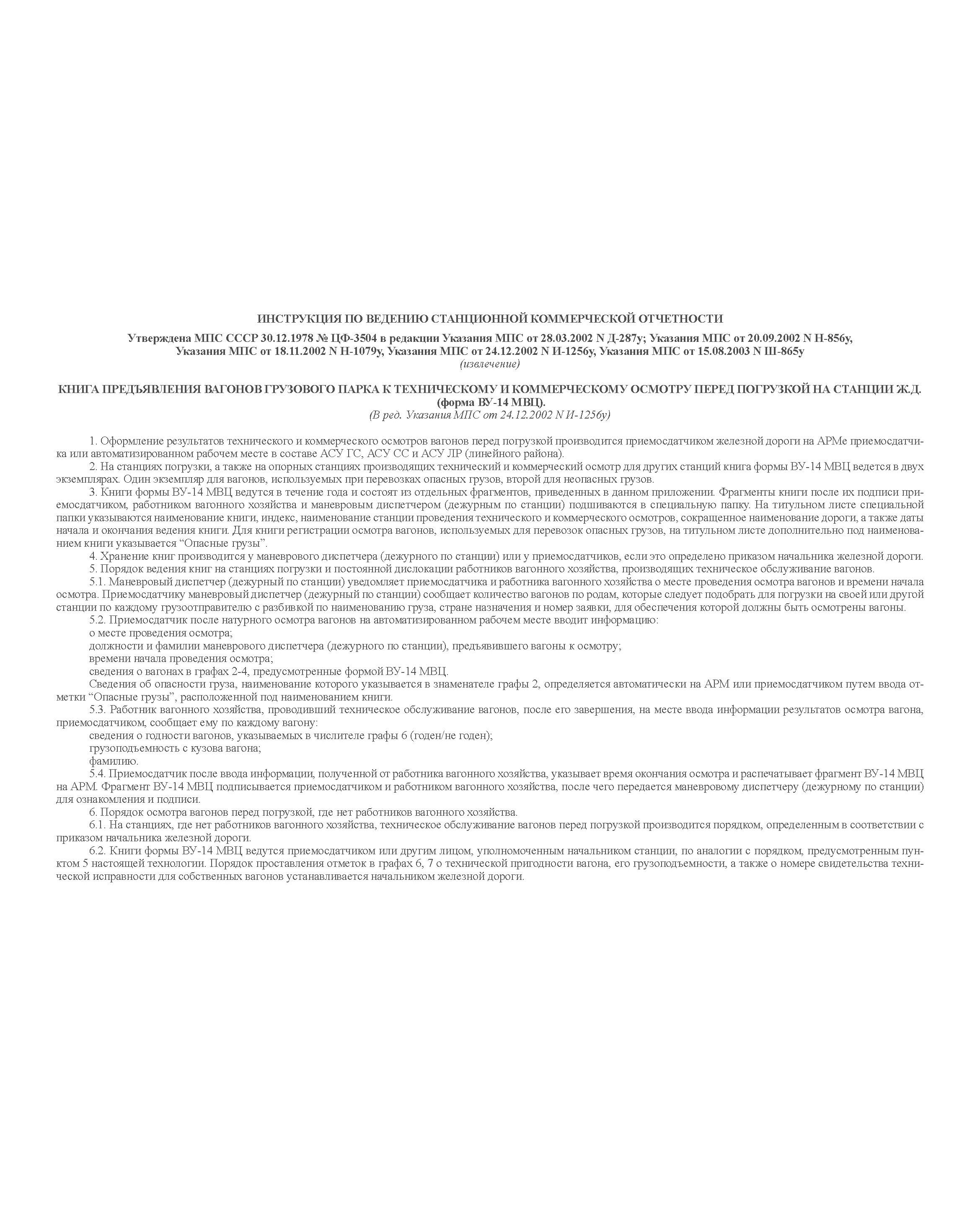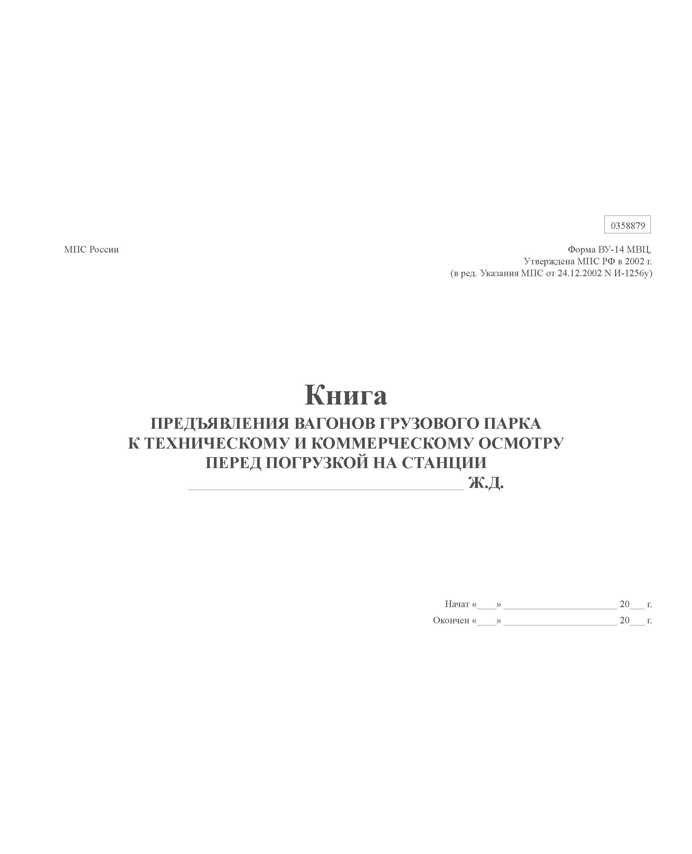 Форма ВУ-14 МВЦ. Книга предъявления вагонов грузового парка к техническому и коммерческому осмотру перед погрузкой на станции. (Инструкция МПС СССР от 30.12.1977 № ЦФ-3504, ред. от 15.08.2003). (прошитый, 100 страниц)