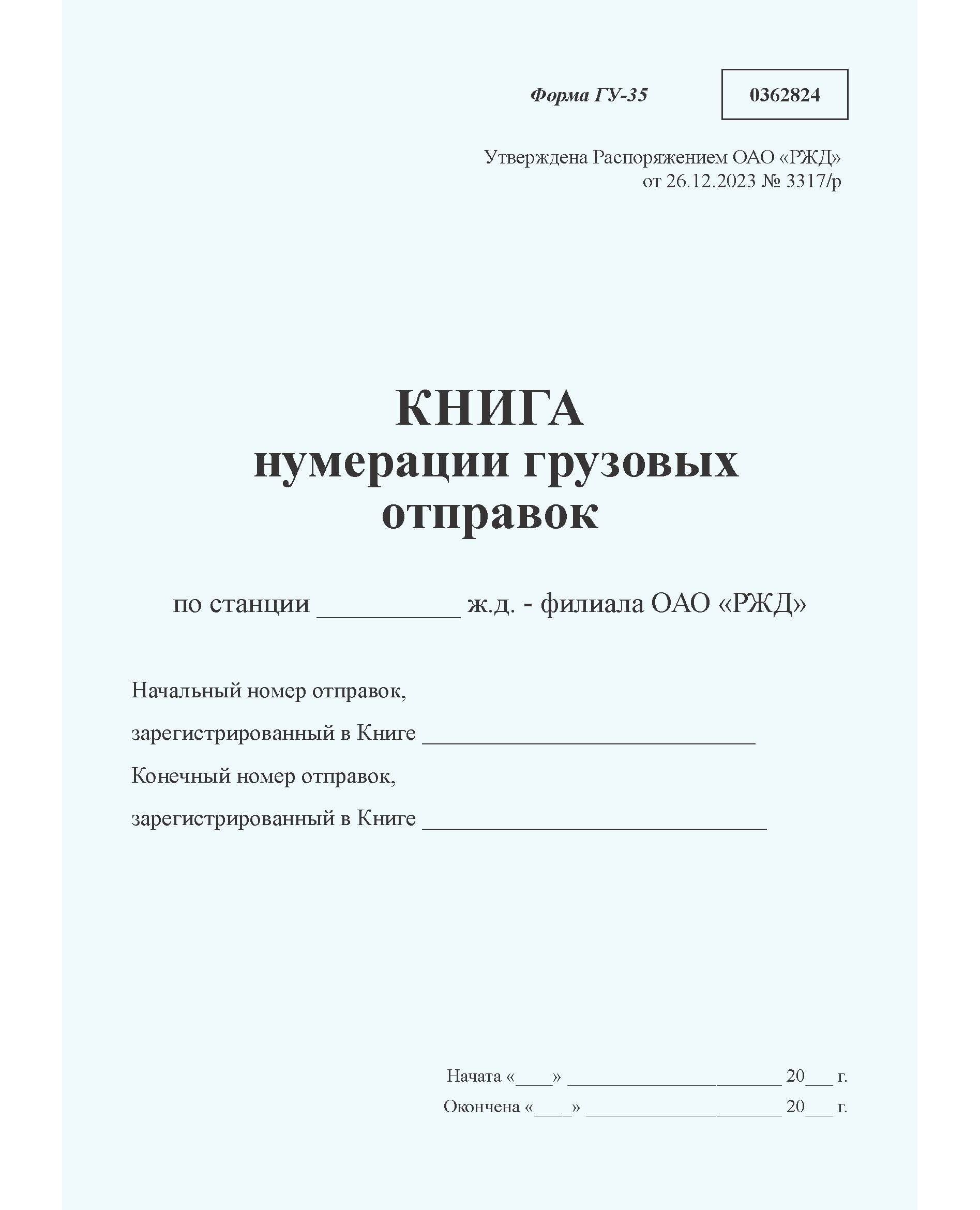 Книга нумерации грузовых отправок формы ГУ-35. Утверждена Распоряжением ОАО "РЖД" от 26.12.2023 № 3317/р