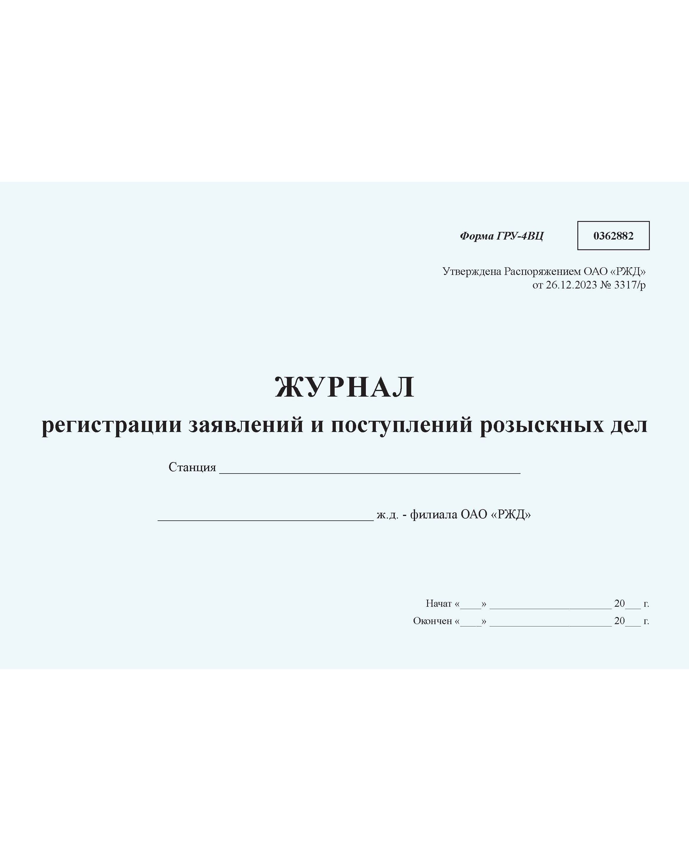 Журнал регистрации заявлений и поступлений розыскных дел формы ГРУ-4ВЦ. Утверждена Распоряжением ОАО "РЖД" от 26.12.2023 № 3317/р