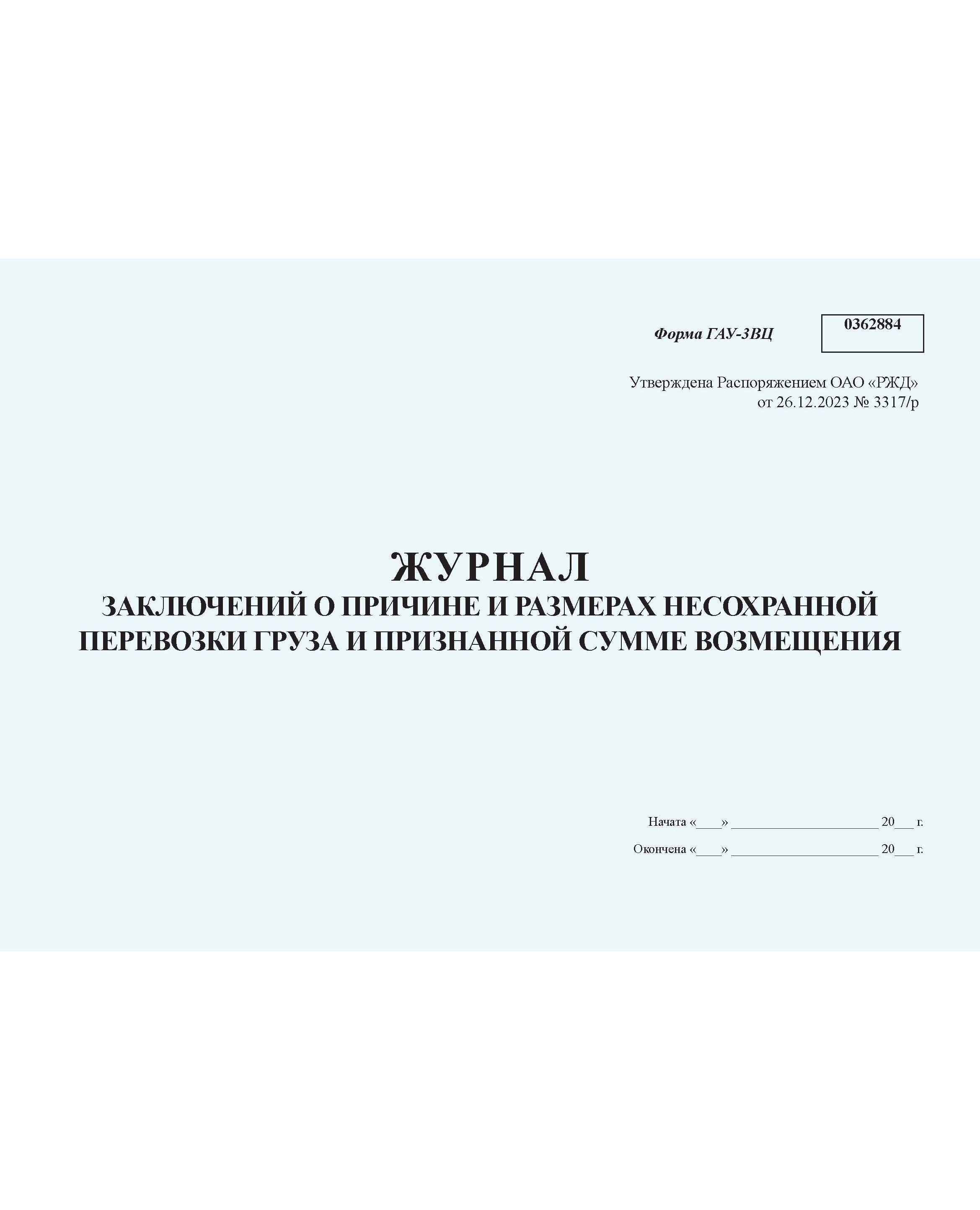 Журнал заключений по причине и размерам несохранной перевозки груза и признанной сумме возмещения. Форма ГАУ-3ВЦ. Утверждена Распоряжением ОАО "РЖД" от 26.12.2023 № 3317/р