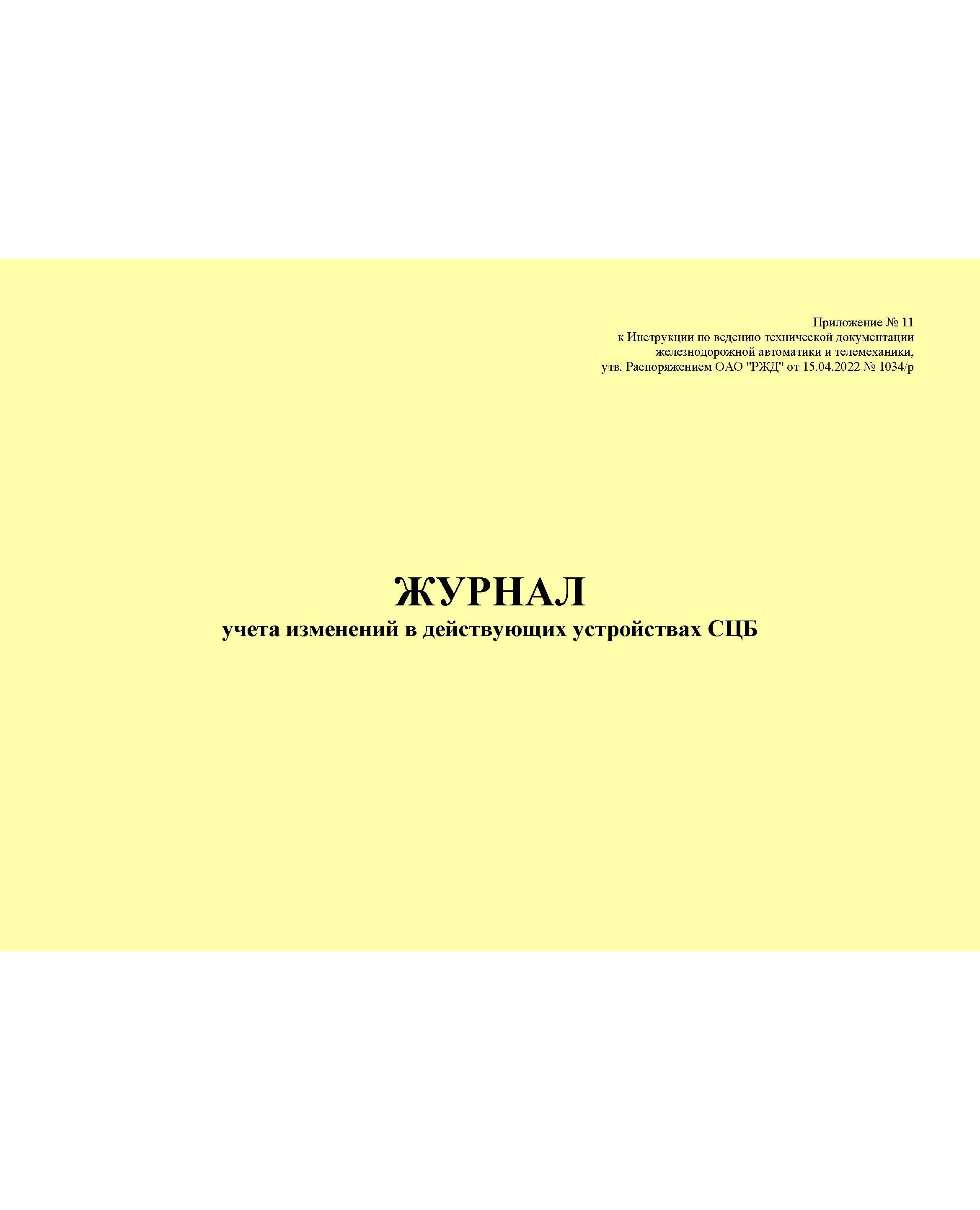 Журнал учета изменений в действующих устройствах СЦБ. Приложение № 11 к Инструкции по ведению технической документации железнодорожной автоматики и телемеханики, утв. Распоряжением ОАО "РЖД" от 15.04.2022 № 1034/р (альбомный, прошитый, 100 страниц)