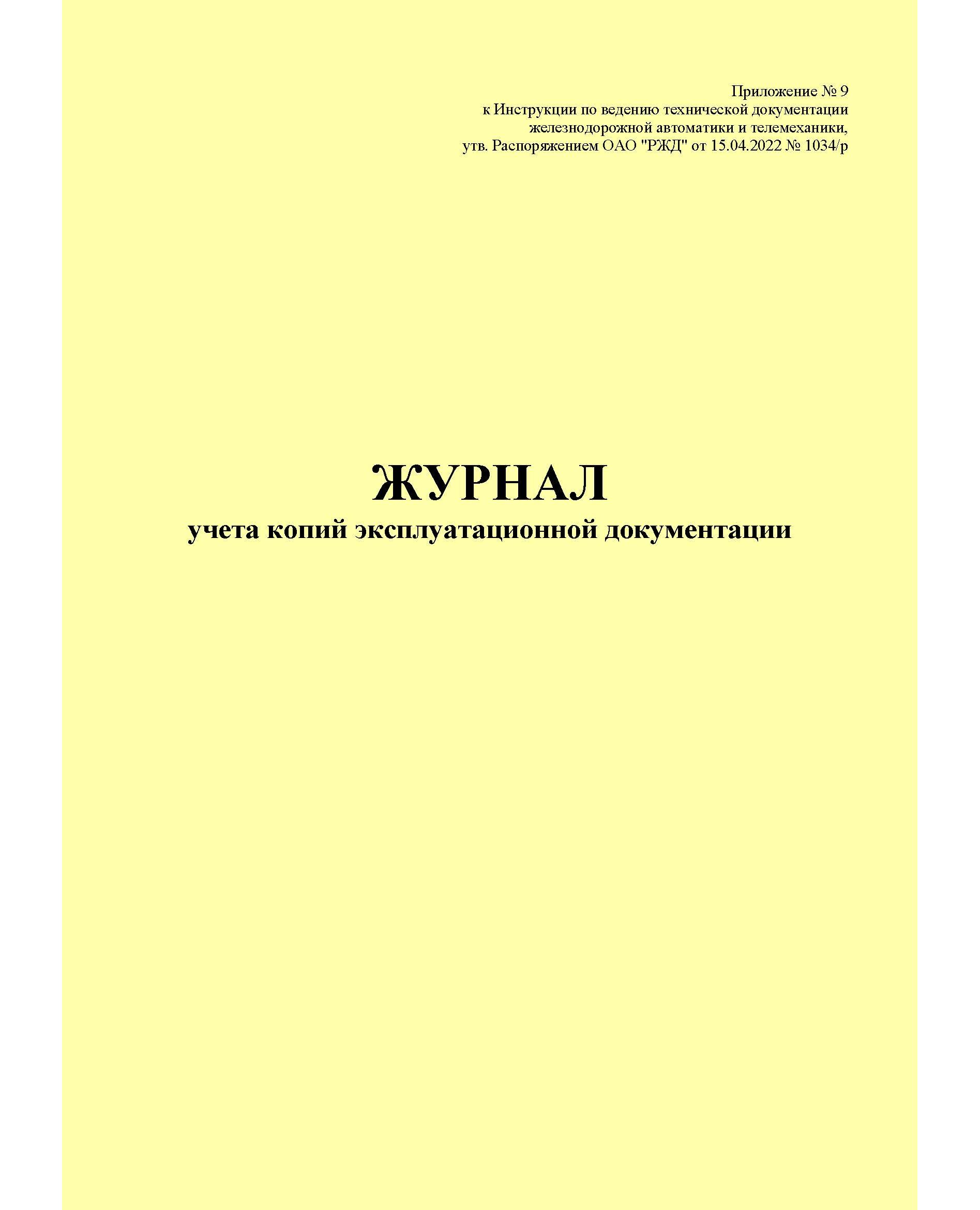 Журнал учета копий эксплуатационной документации. Приложение № 9 к Инструкции по ведению технической документации железнодорожной автоматики и телемеханики, утв. Распоряжением ОАО "РЖД" от 15.04.2022 № 1034/р (книжный, прошитый, 100 страниц)