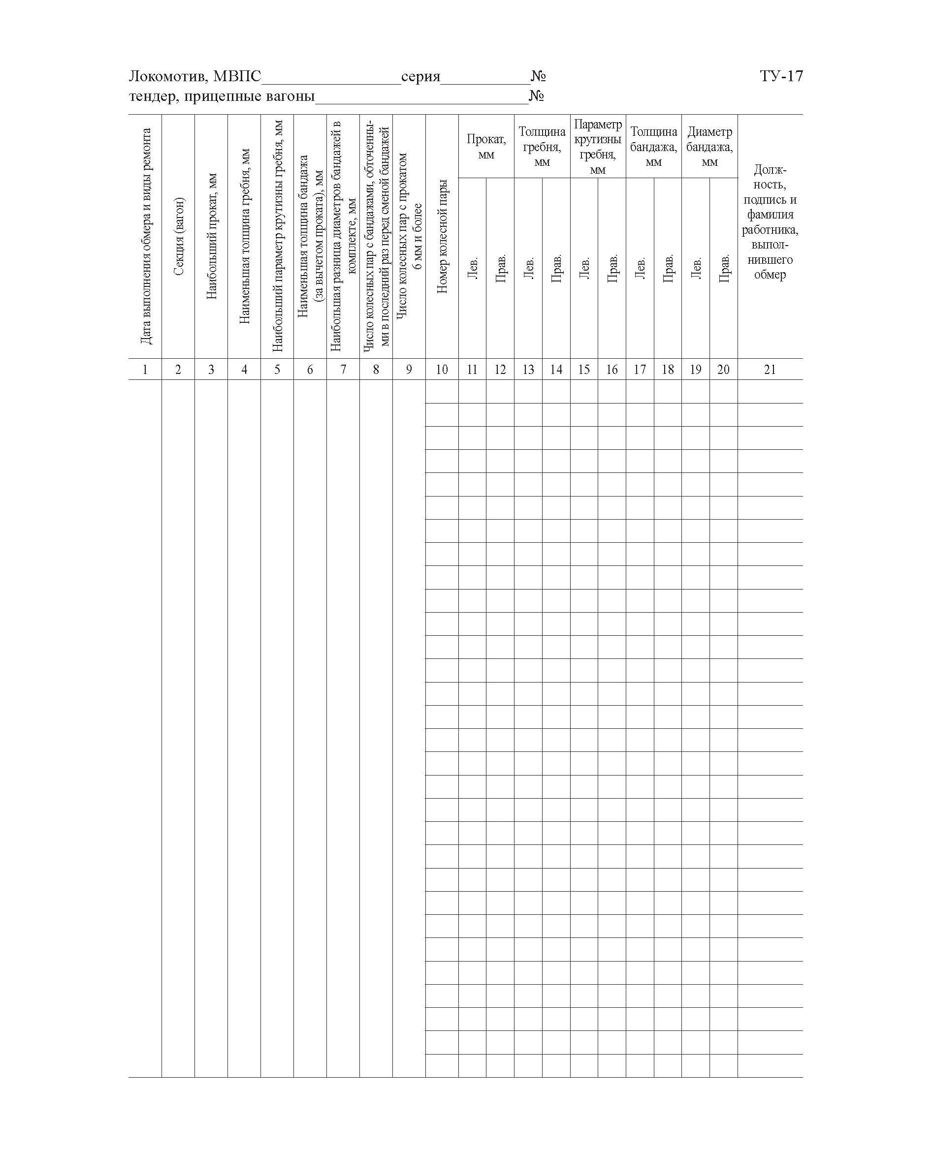 При заполнении книги в графы 2 и 10 -18 переносятся значения из соответствующих граф карманной книжки формы ТУ-18. В графах 3 - 9 указываются значения, наиболее близкие к предельным (браковочным). Для наглядности замеры по секциям локомотивов и вагонам МВПС разделяются жирной чертой.