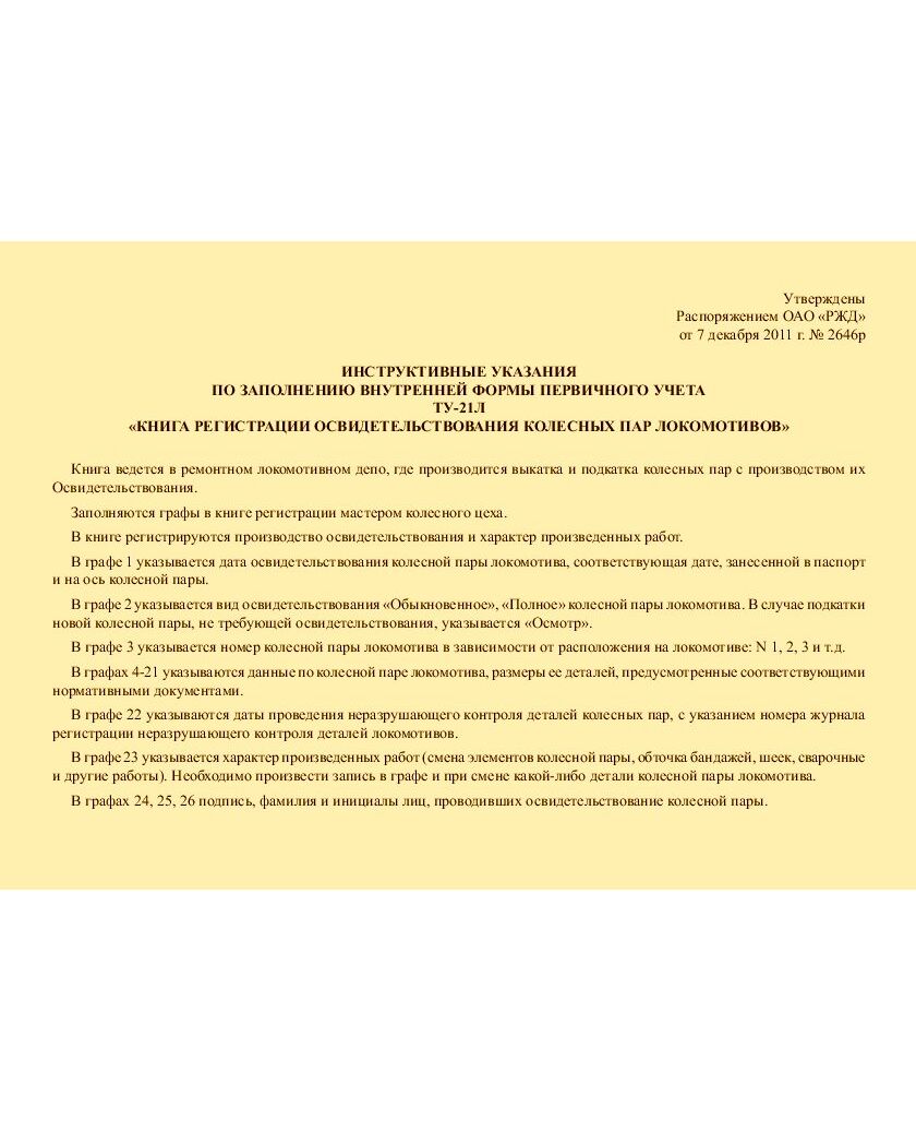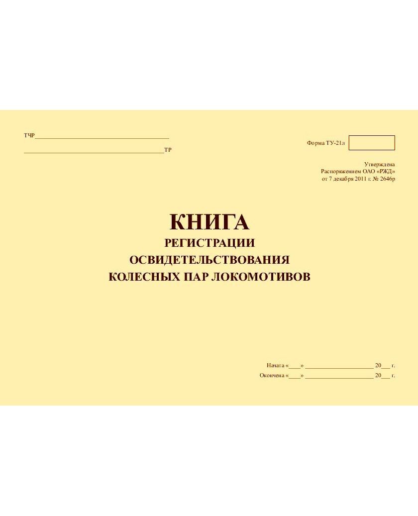 Форма ТУ-21л. Книга регистрации освидетельствования колесных пар локомотивов. Утв. Распоряжением ОАО "РЖД" от 07.12.2011 № 2646р. (прошитый, 100 страниц)