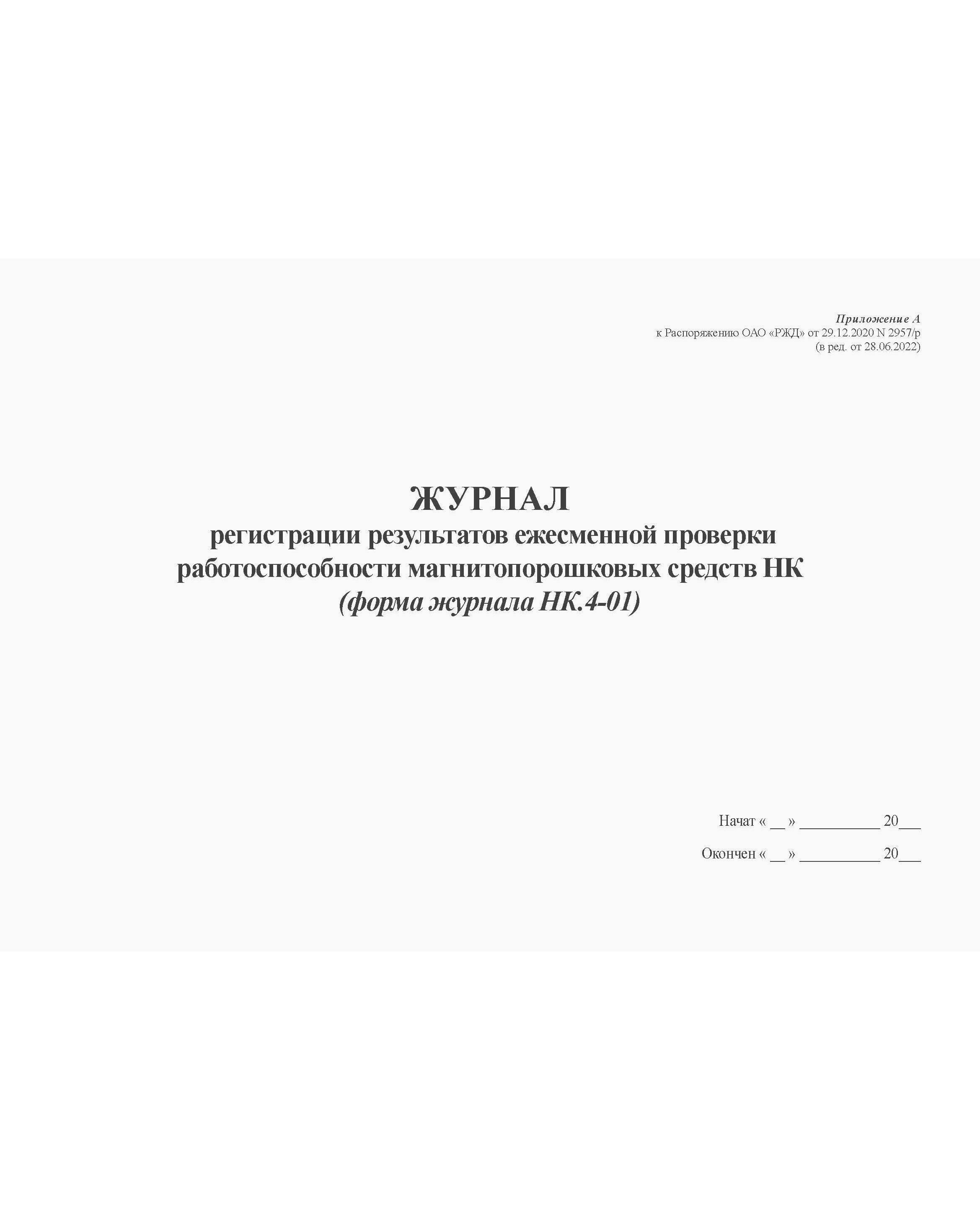 Журнал регистрации результатов ежесменной проверки работоспособности магнитопорошковых средств НК (форма журнала НК.4-01). Приложение А к Распоряжению ОАО "РЖД" от 29.12.2020 N 2957/р (в ред. от 28.06.2022) (альбомный, прошитый, 100 страниц)