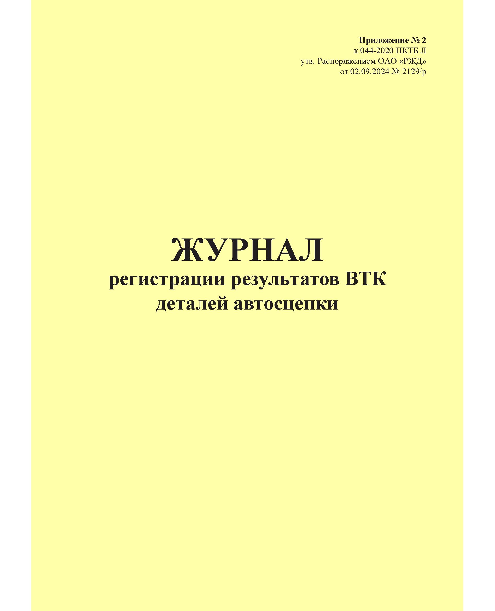 Журнал регистрации результатов ВТК деталей автосцепки. Приложение № 2 к 076-2024 ПКТБ Л (прошитый, 100 страниц)
