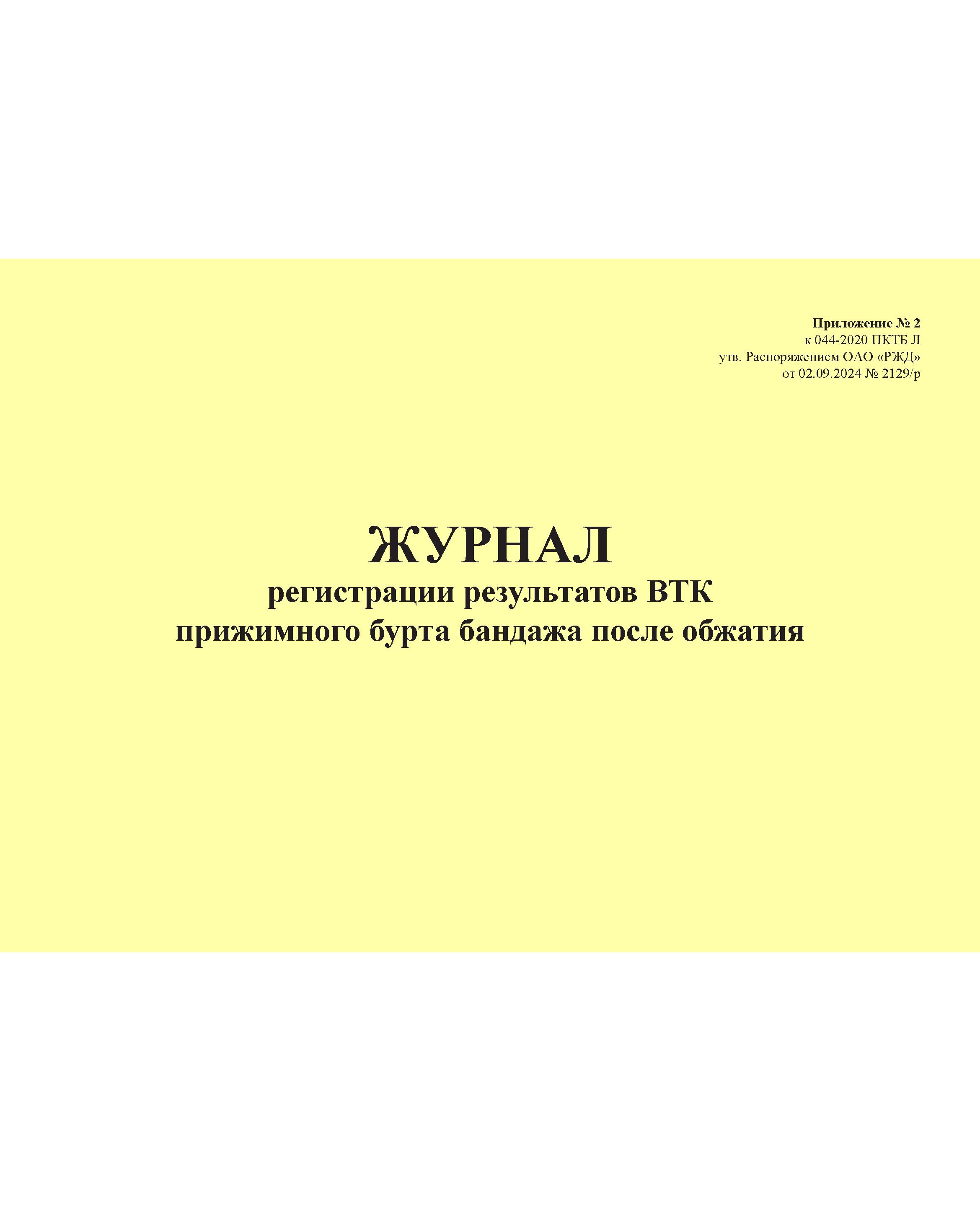 Журнал регистрации результатов ВТК прижимного бурта бандажа после обжатия. Приложение № 2 к 076-2024 ПКТБ Л (прошитый, 100 страниц)