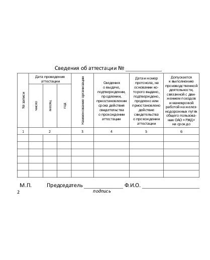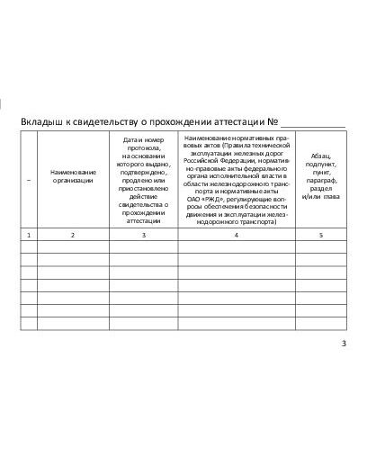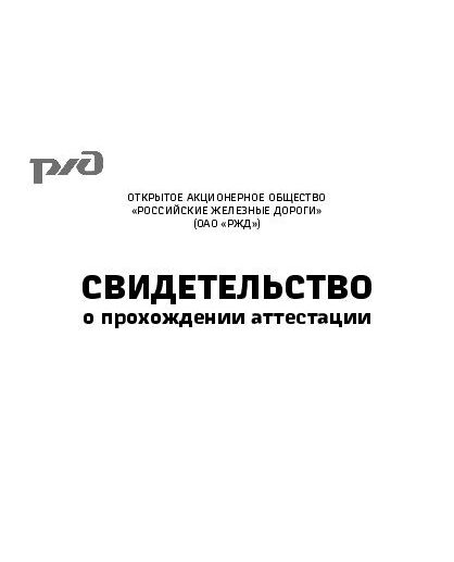 Свидетельство о прохождении аттестации работников, производственная деятельность которых связана с движением поездов и маневровой работой на железнодорожных путях общего пользования ОАО «РЖД». Приложение № 3 Распоряжение ОАО «РЖД» от 17.01.2015 № 66р (А6, альб., 20 стр.)
