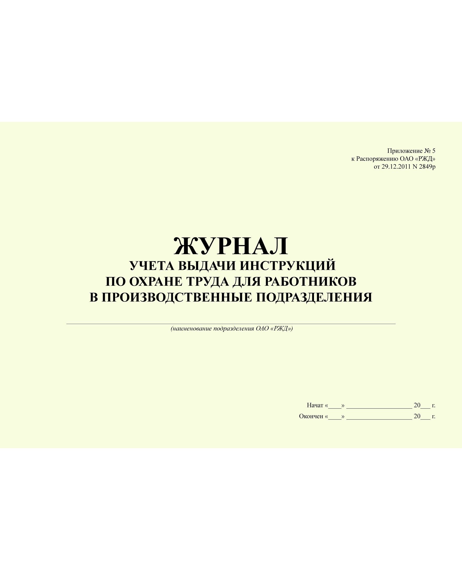 Журнал учета выдачи инструкций по охране труда для работников в производственные подразделения (Приложение № 5 к Распоряжению ОАО "РЖД" от 21.11.2016 № 2355р). (прошитый, 100 страниц)