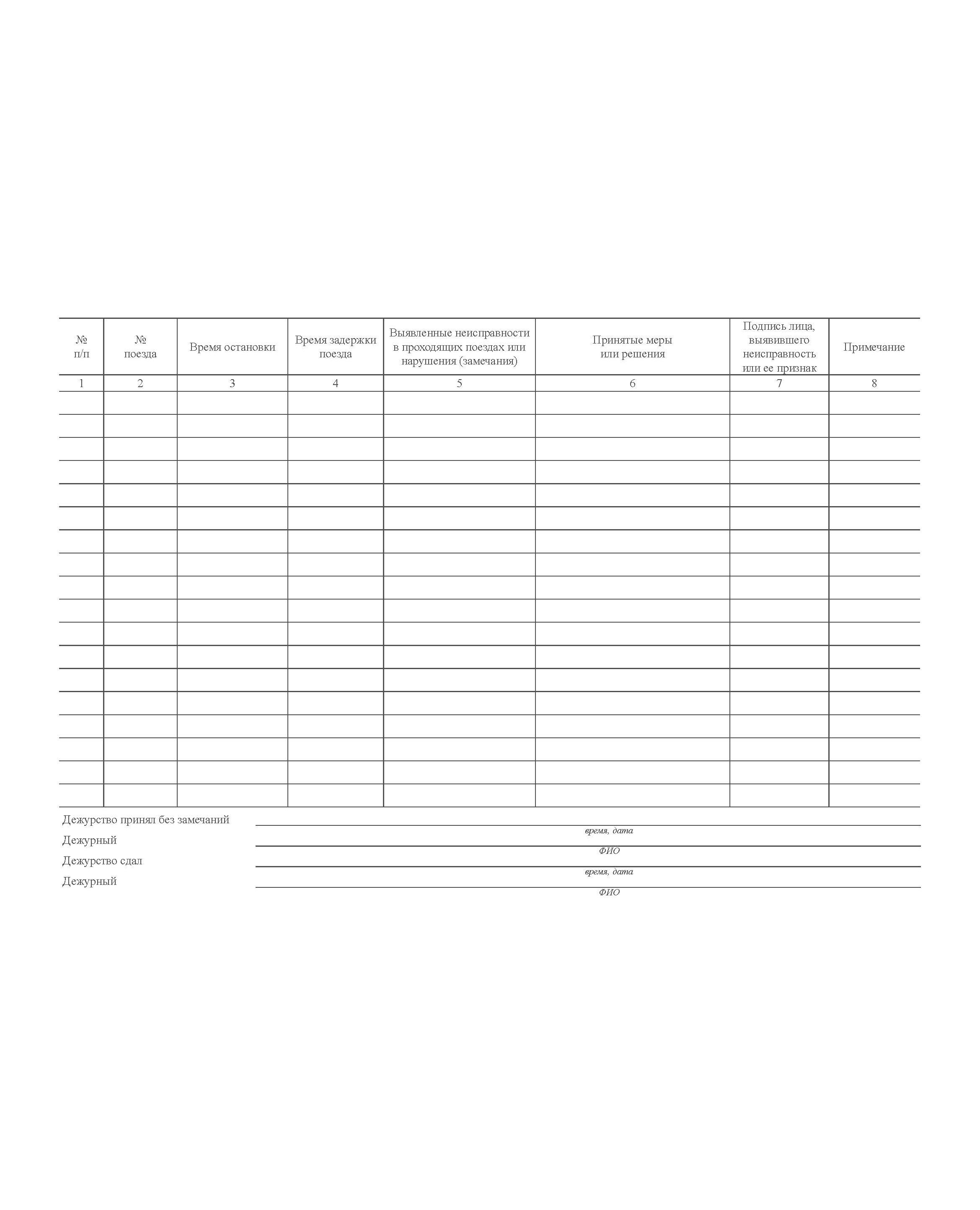Журнал учета неисправностей, выявленных в проходящих поездах на посту безопасности. Приложение № 3 к Положению по организации системы контроля подвижного состава ОАО "РЖД" № 937-2021 ПКБ ЦВ в редакции Распоряжения ОАО "РЖД" от 29.10.2024 № 2653/р (альбомный, прошитый, 100 страниц)