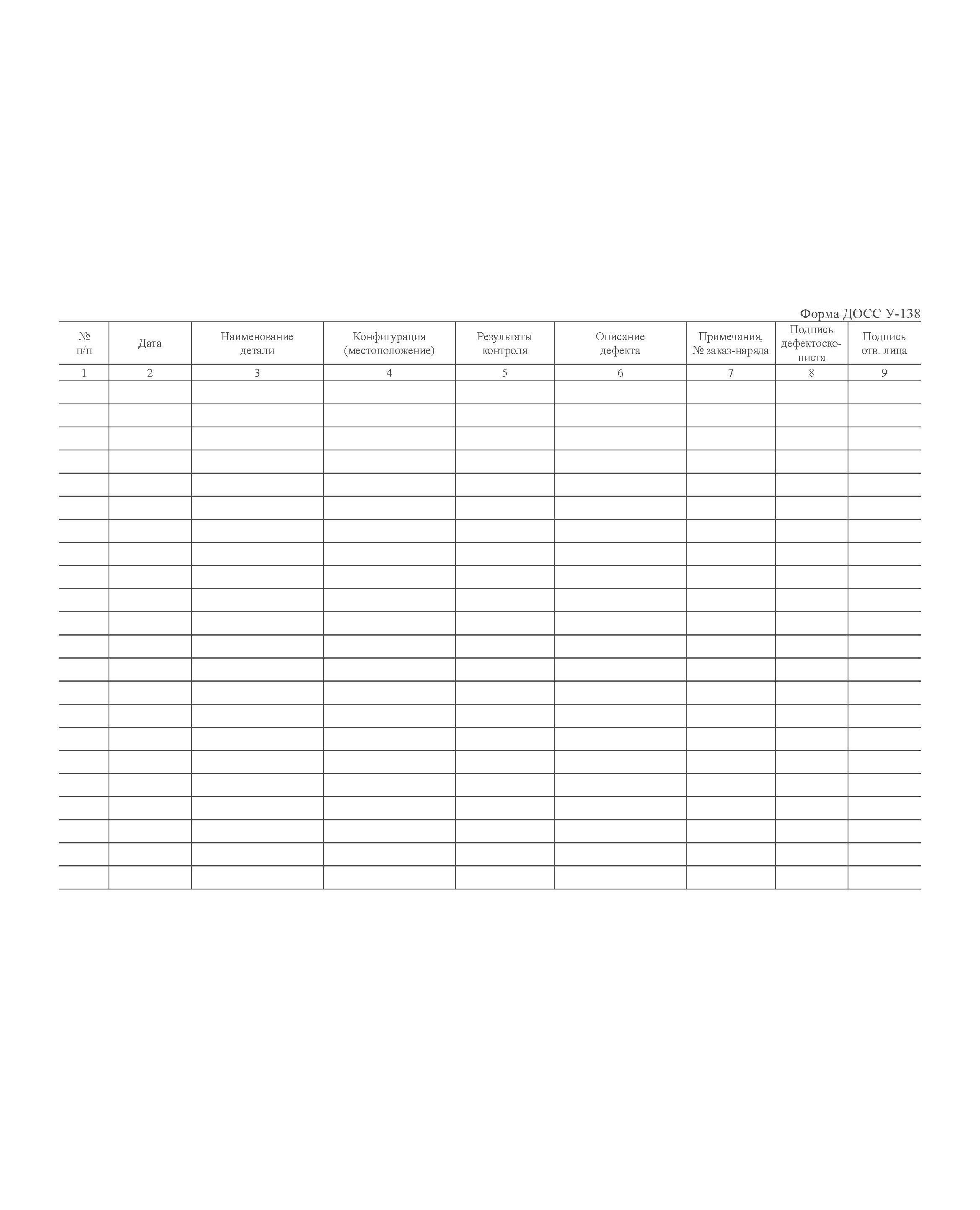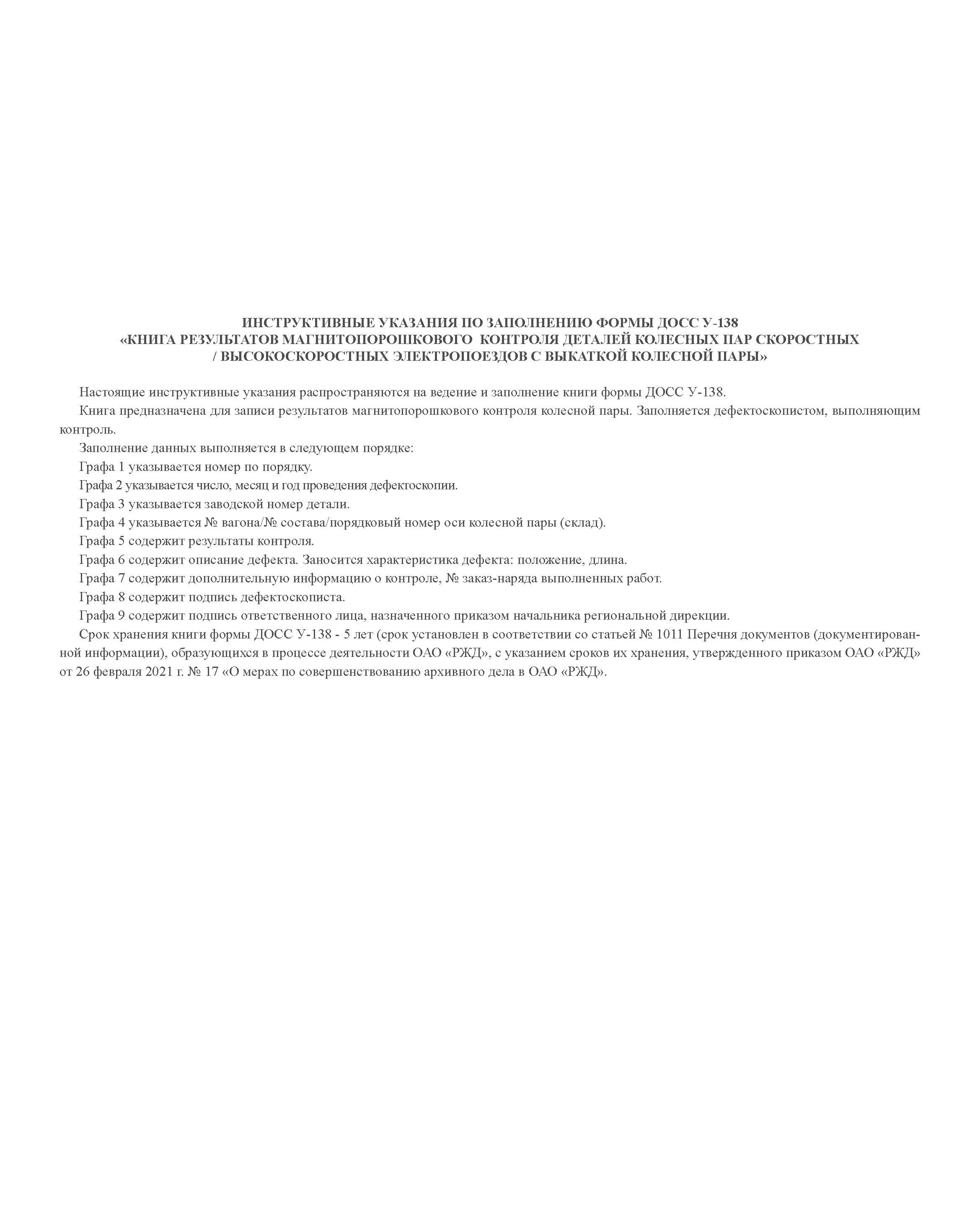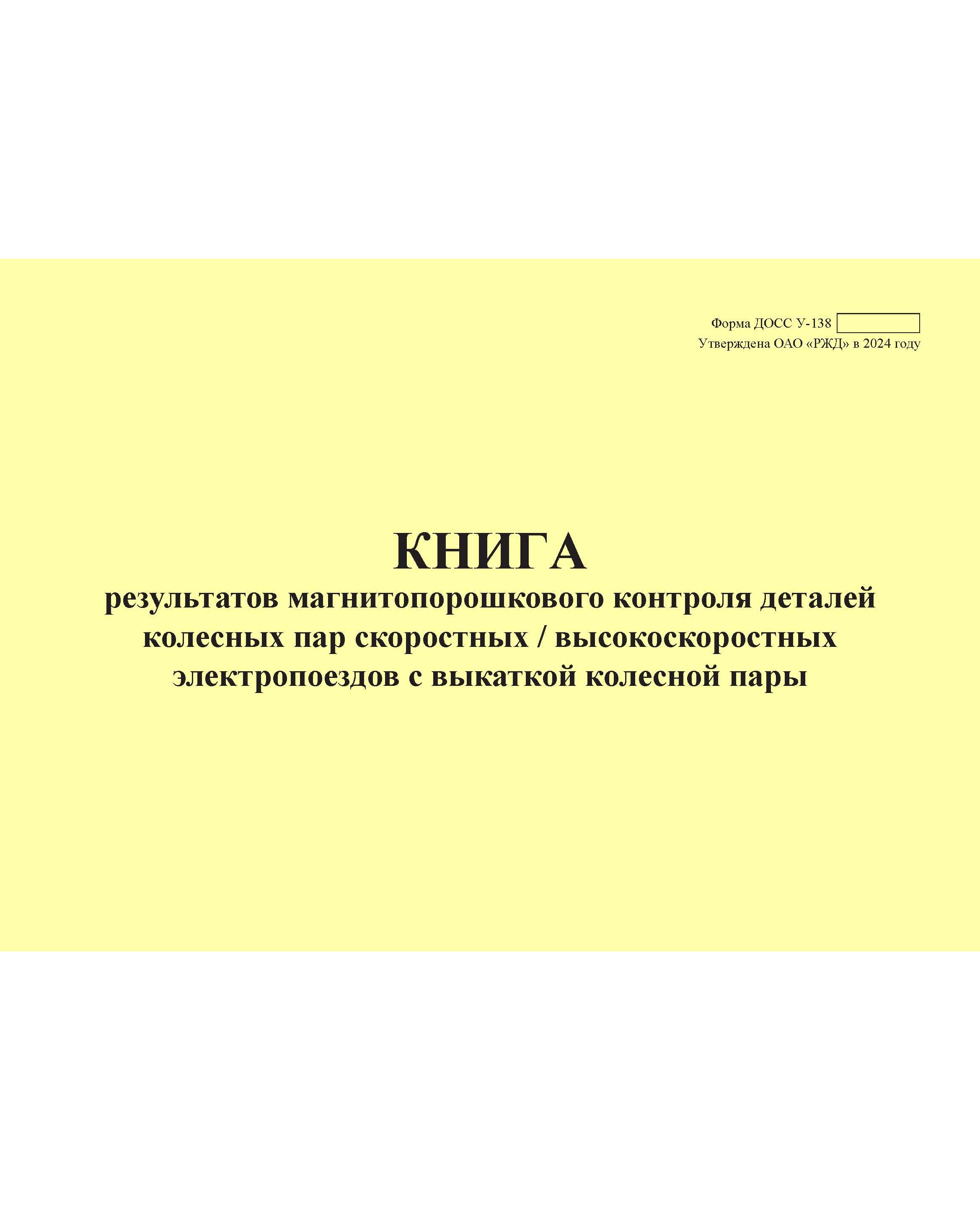 Форма ДОСС У-138. Книга результатов магнитопорошкового контроля деталей колесных пар скоростных / высокоскоростных электропоездов с выкаткой колесной пары. утв. Распоряжением ОАО "РЖД" от 14.02.2024 № 426/р (альбомный, прошитый, 100 страниц)