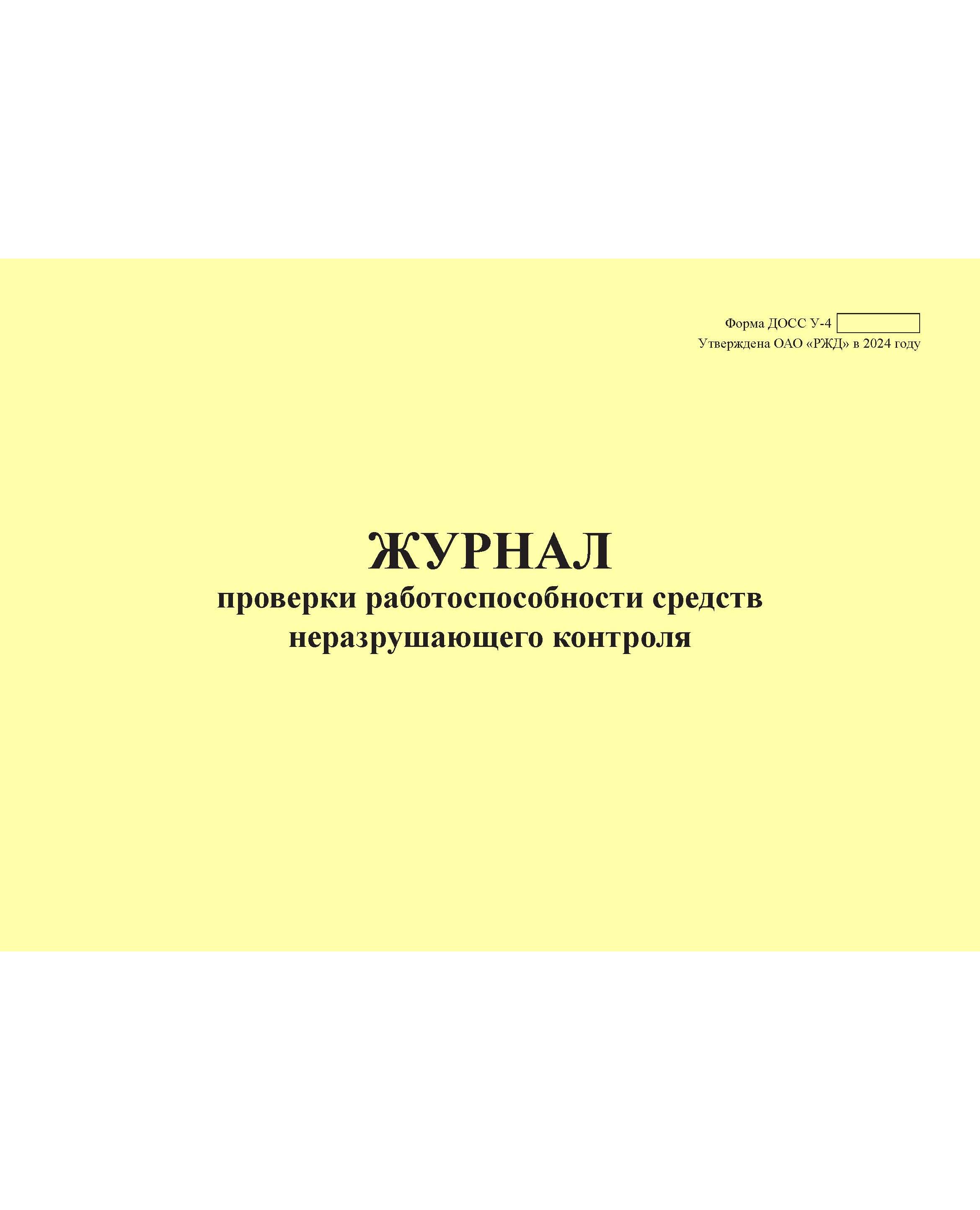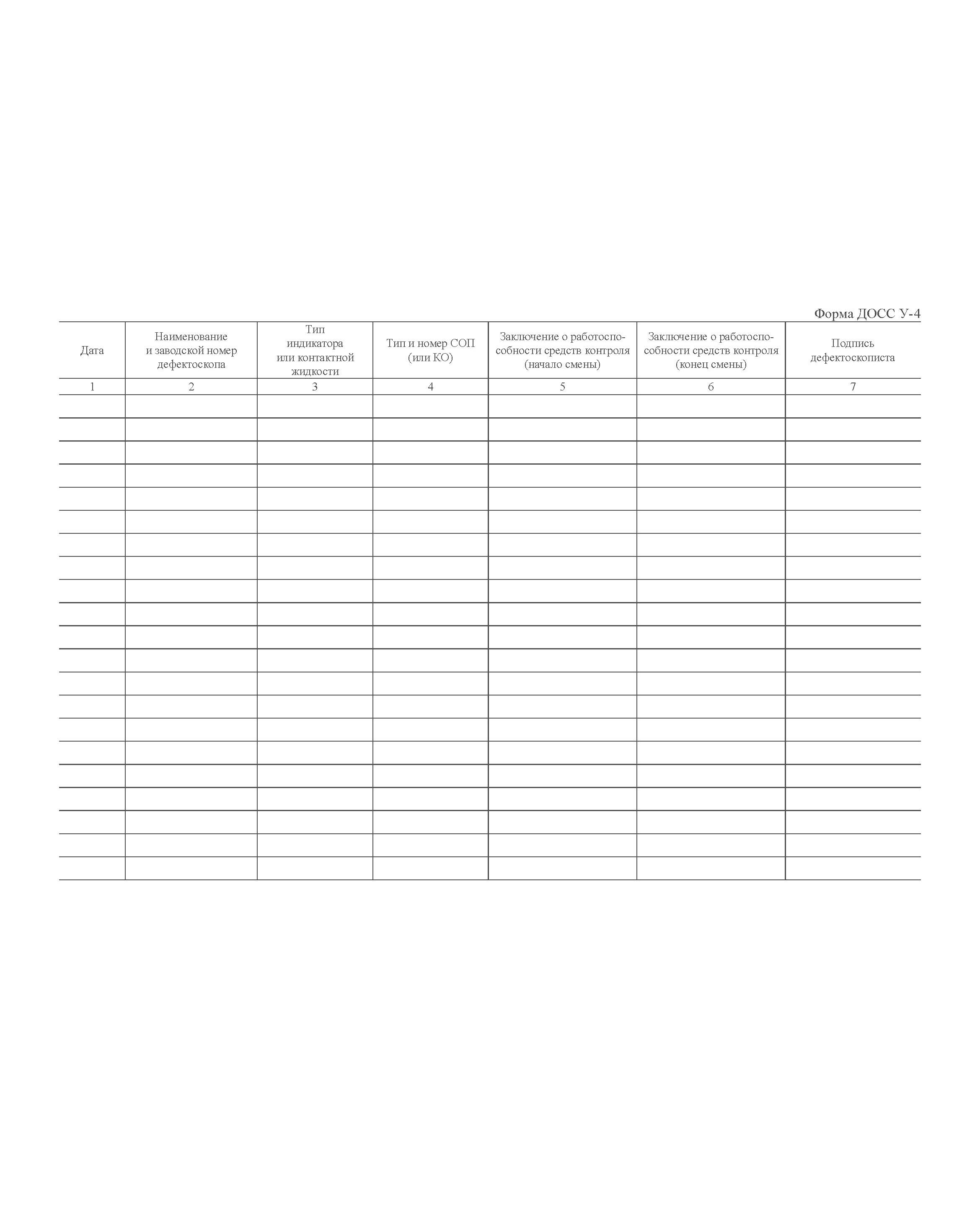 В журнале формы ДОСС У-4 регистрируются результаты проверок и настроек средств контроля на работоспособность при помощи стандартных образцов предприятия с искусственными отражателями и контрольными образцами с естественными дефектами пе-ред производством работ по дефектоскопии.