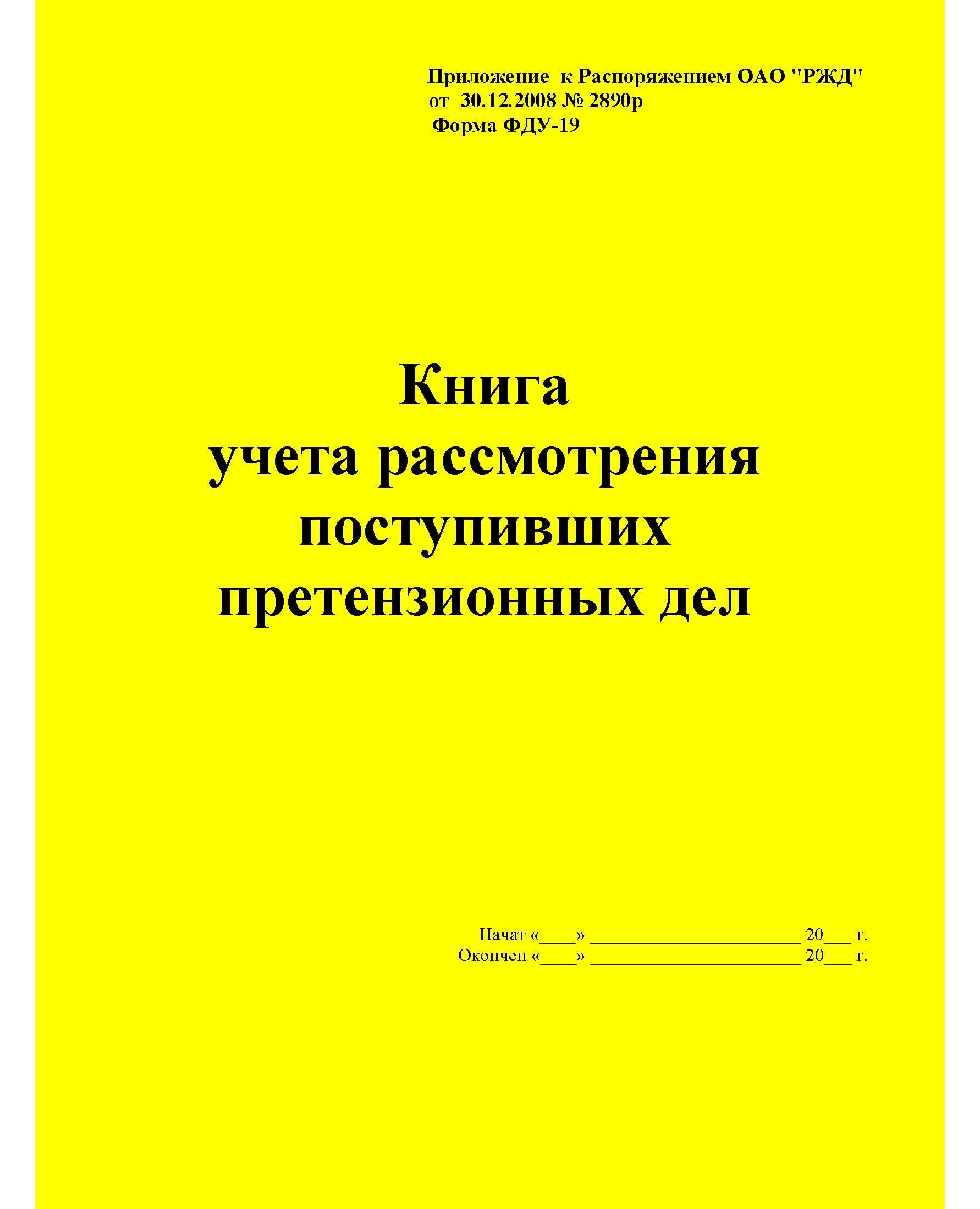 Форма ФДУ-19. Книга учета рассмотрения поступивших претензионных дел. Утв. Распоряжением ОАО "РЖД" от 30.12.2008 № 2890р. (прошитый, 100 страниц)