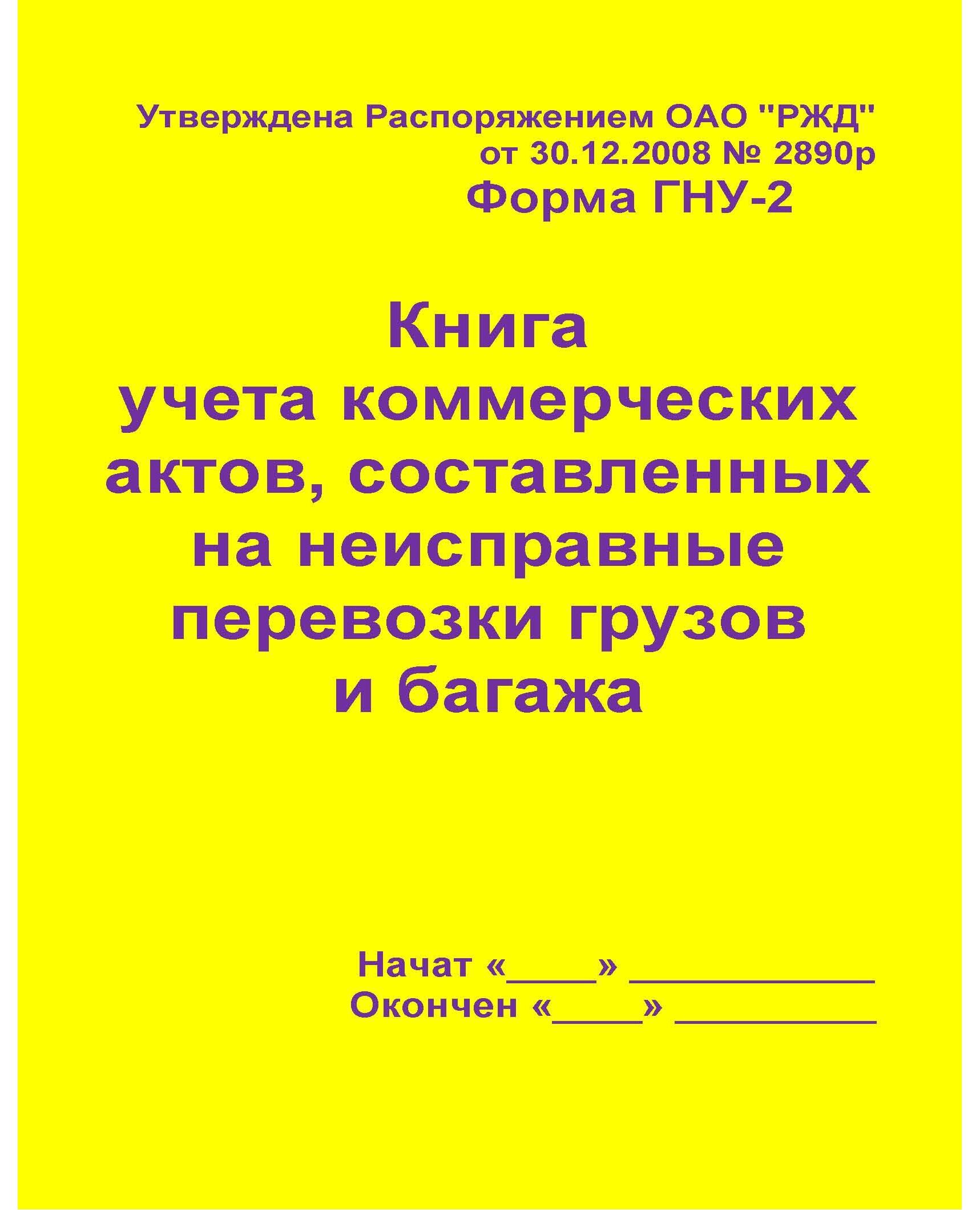 Форма ГНУ-2. Книга учета коммерческих актов, составленных на неисправные перевозки грузов и багажа. Утв. Распоряжением ОАО "РЖД" от 30.12.2008 № 2890р. (прошитый, 100 страниц)
