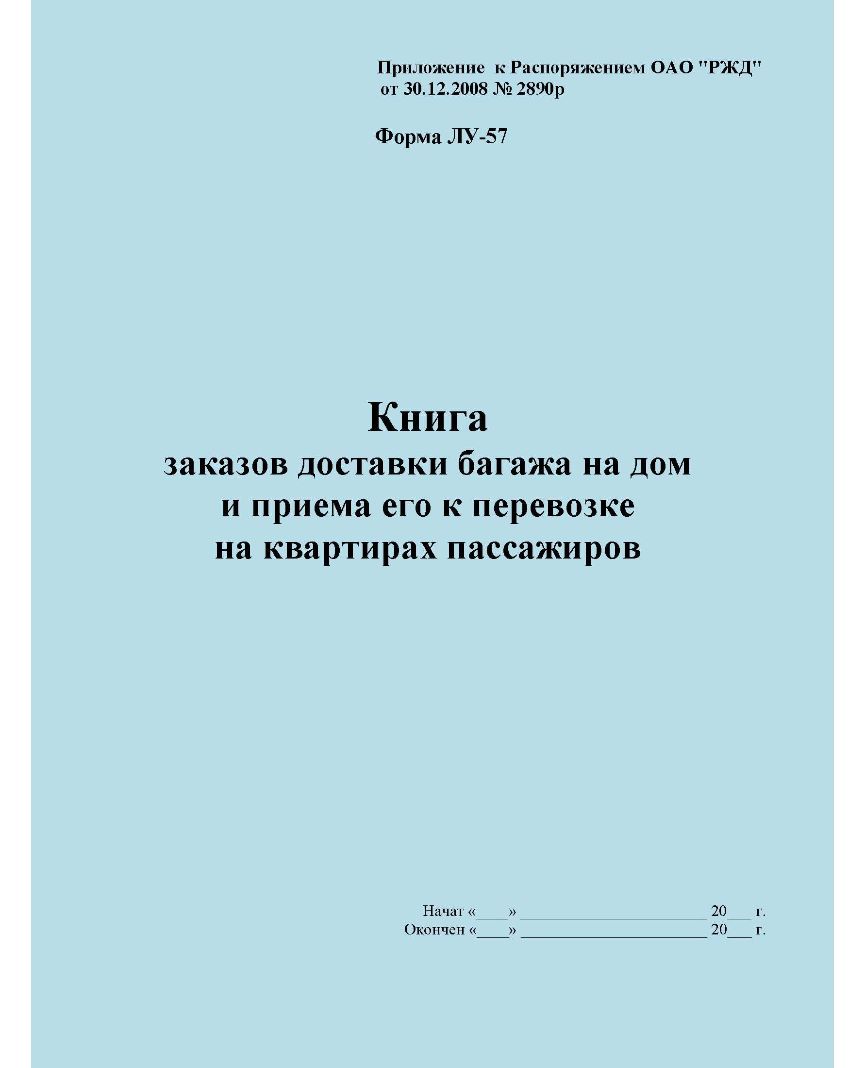 Форма ЛУ-57. Книга заказов доставки багажа на дом и приема его к перевозке на квартирах пассажиров. Утв. Распоряжением ОАО "РЖД" от 30.12.2008 № 2890р. (прошитый, 100 страниц)