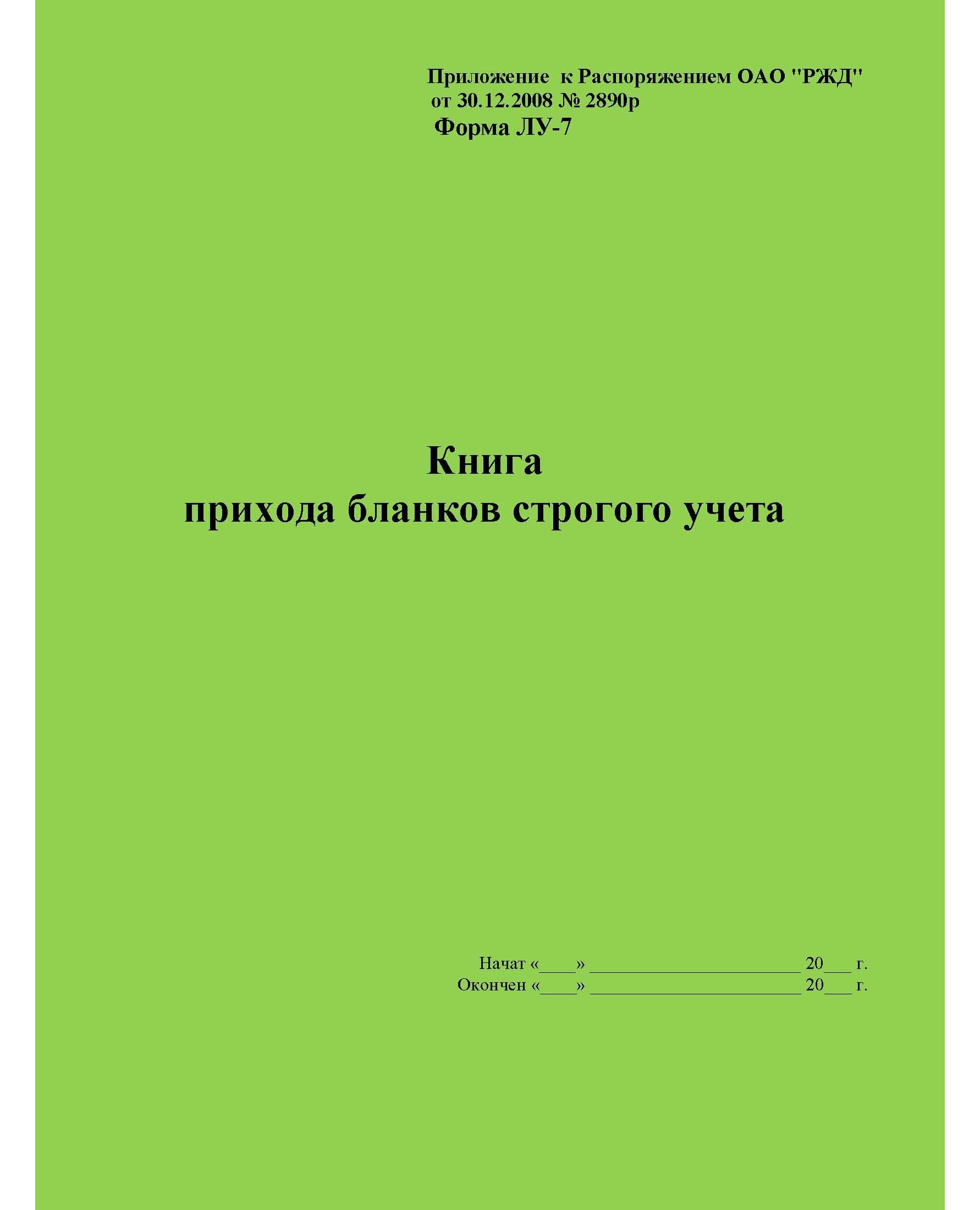 Форма ЛУ-7. Книга прихода бланков строгого учета. Утв. Распоряжением ОАО "РЖД" от 30.12.2008 № 2890р. (прошитый, 100 страниц)
