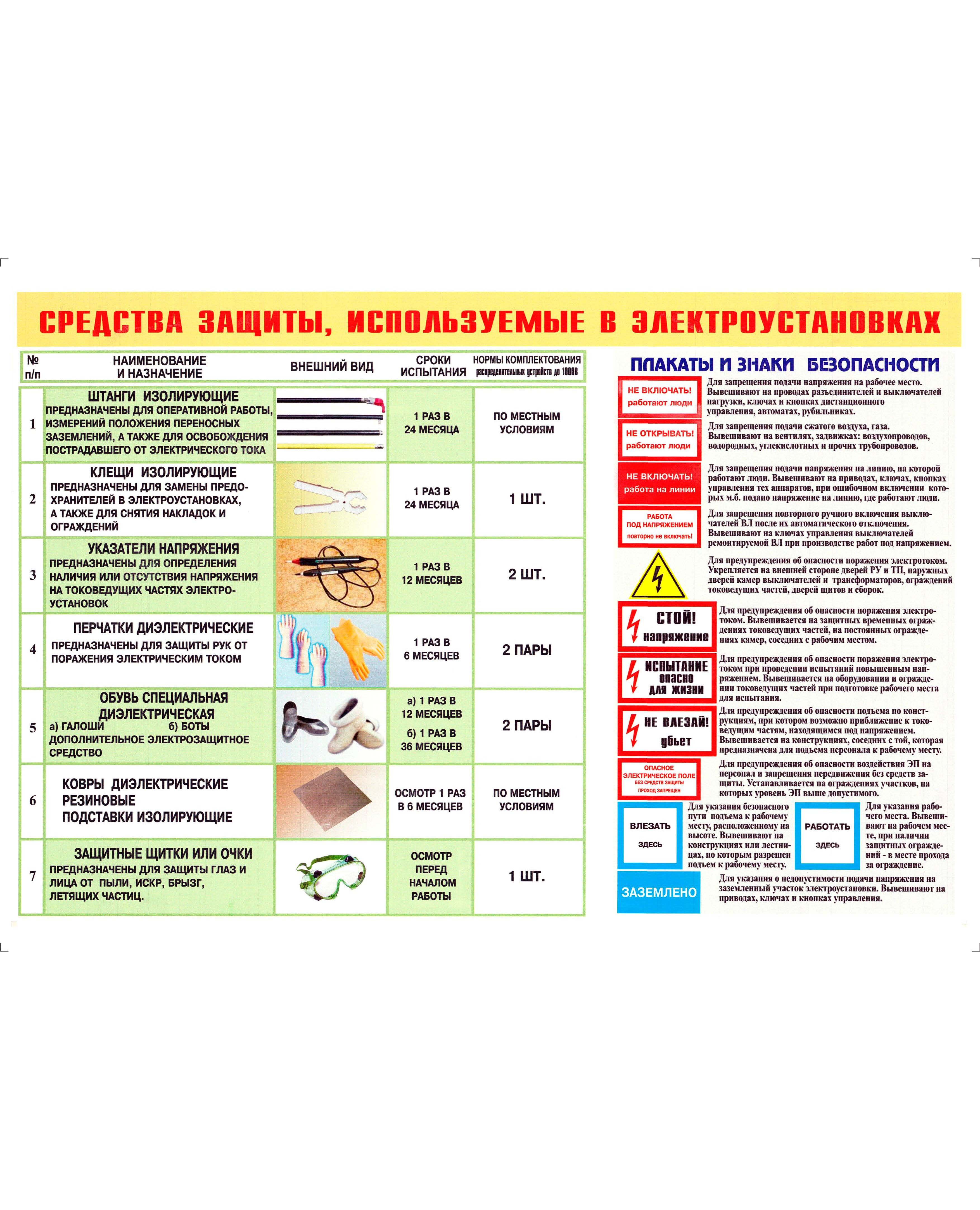 Плакат: Средства защиты, используемые в электроустановках. Нормы и сроки их испытания. 1 лист, формат А2, ламинированный