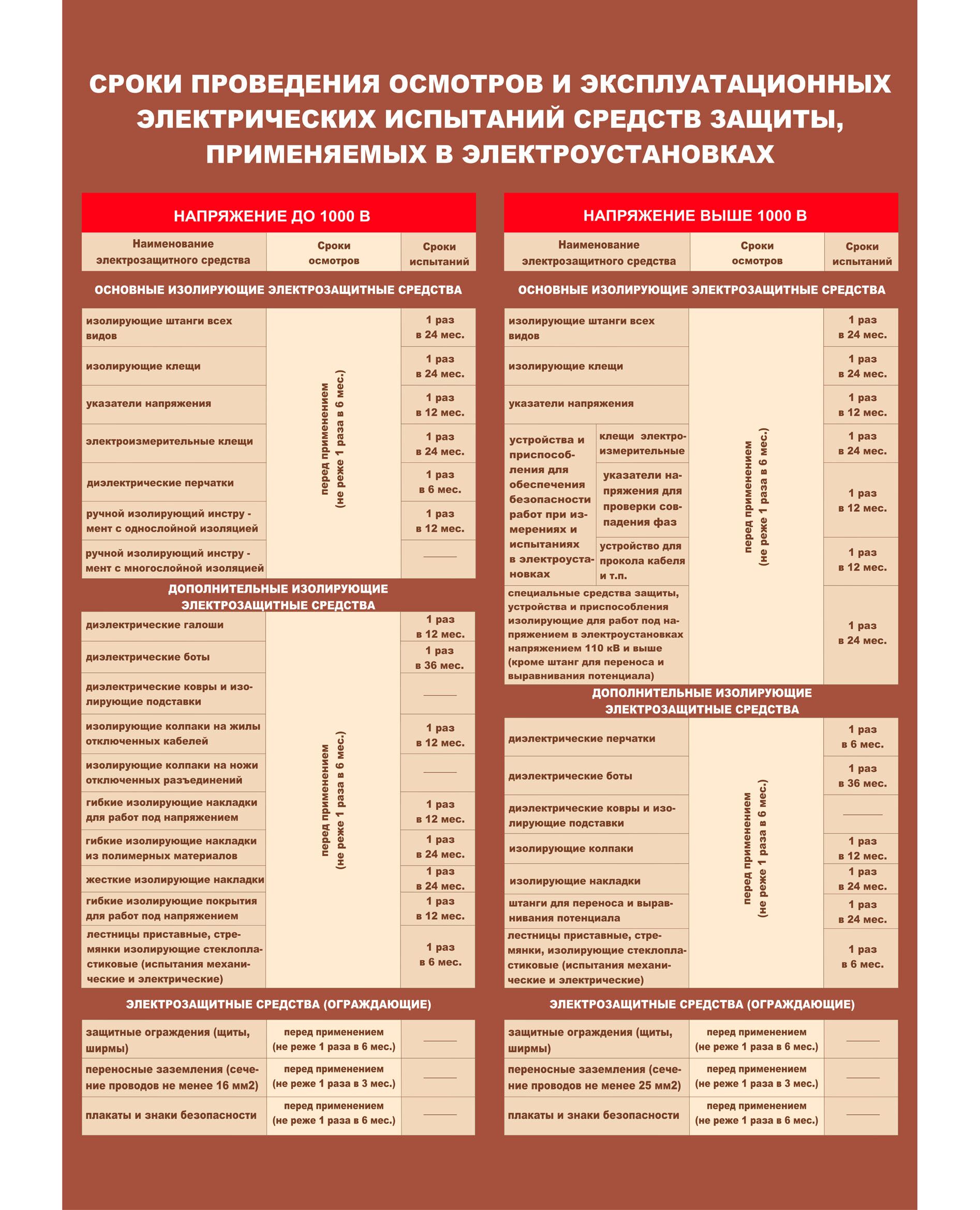 Плакат: Сроки проведения осмотров и эксплуатационных электрических испытаний средств защиты применяемых в электроустановках, 1 штука, формат А2, ламинированный