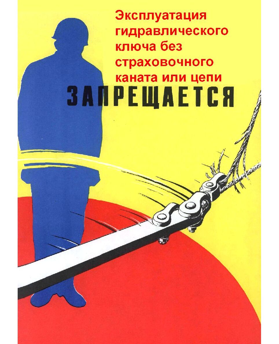 Плакат: Эксплуатация гидравлического ключа без страховочного каната или цепи запрещается, 1 штука, формат А3, ламинированный