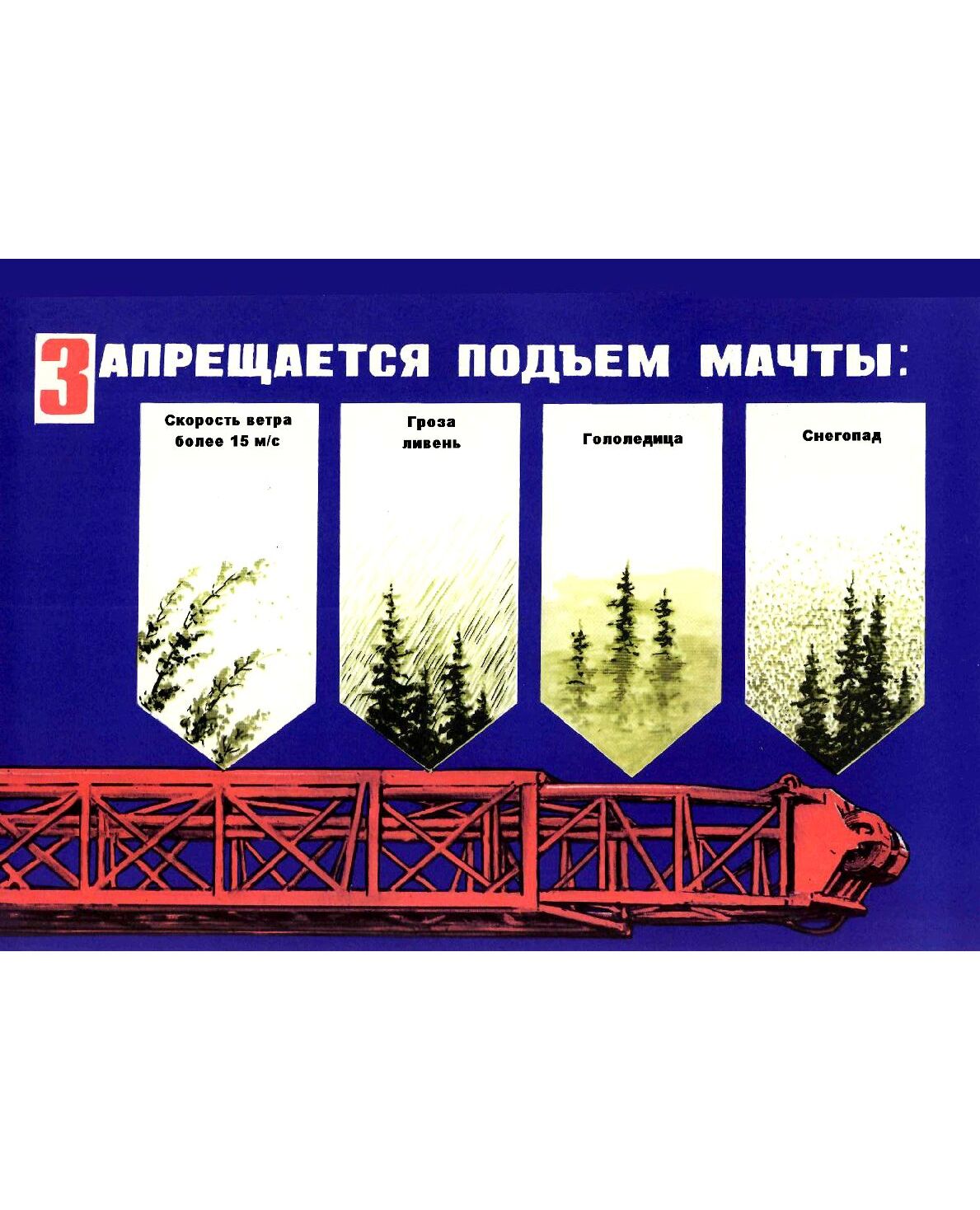 Плакат: Запрещается подъем мачты: скорость ветра более 15 м/с, гроза, ливень, гололедица, снегопад, 1 штука, формат А3, ламинированный
