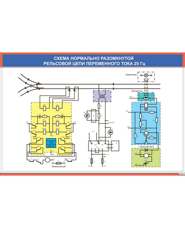 Схема нормально разомкнутой рельсовой цепи переменного тока 25 Гц (900 х 600 мм, ламинированный, с пластиковым профилем и стальным крючком)
