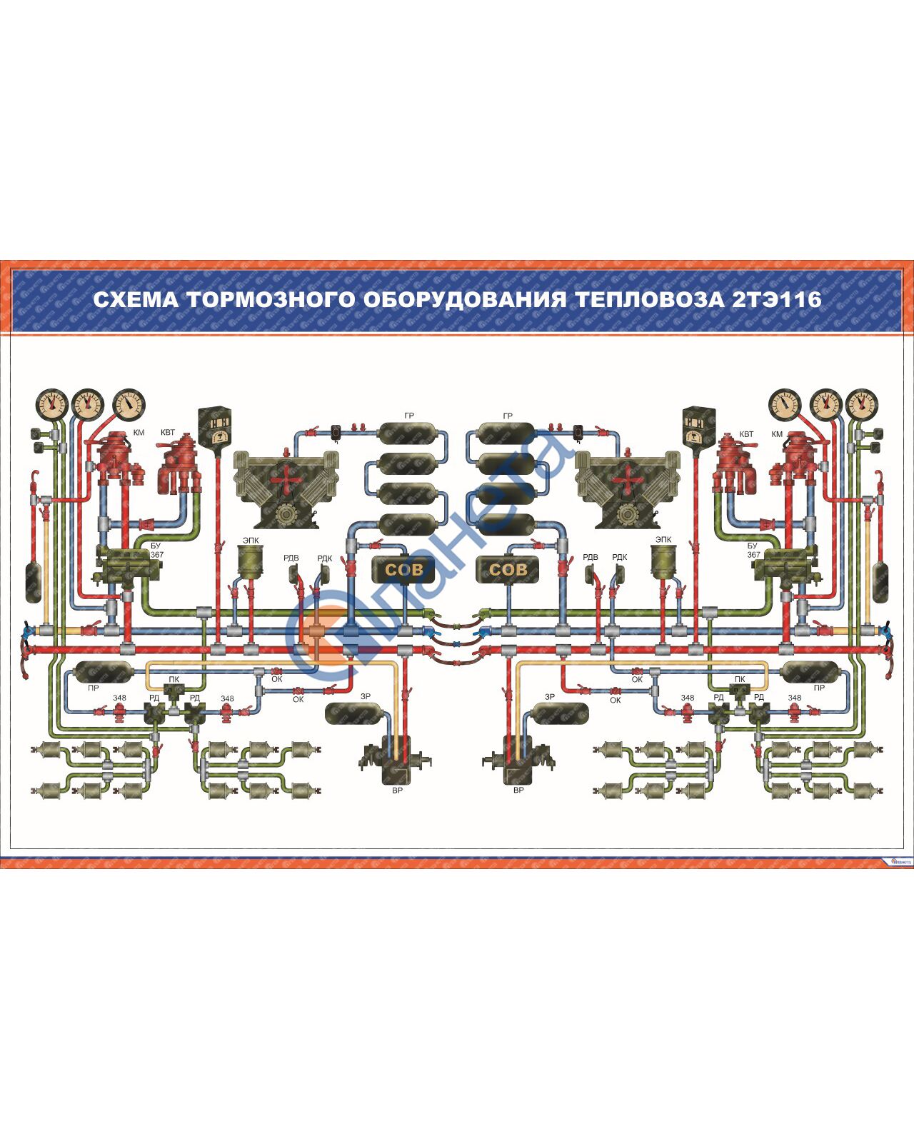 Схема тормозного оборудования тепловоза 2ТЭ116 (600 х 900 мм, ламинированный, с пластиковым профилем и стальным крючком)