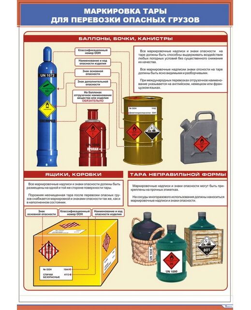 Плакат: Маркировка тары для перевозки опасных грузов (600 х 900 мм, ламинированный, с пластиковым профилем и стальным крючком)