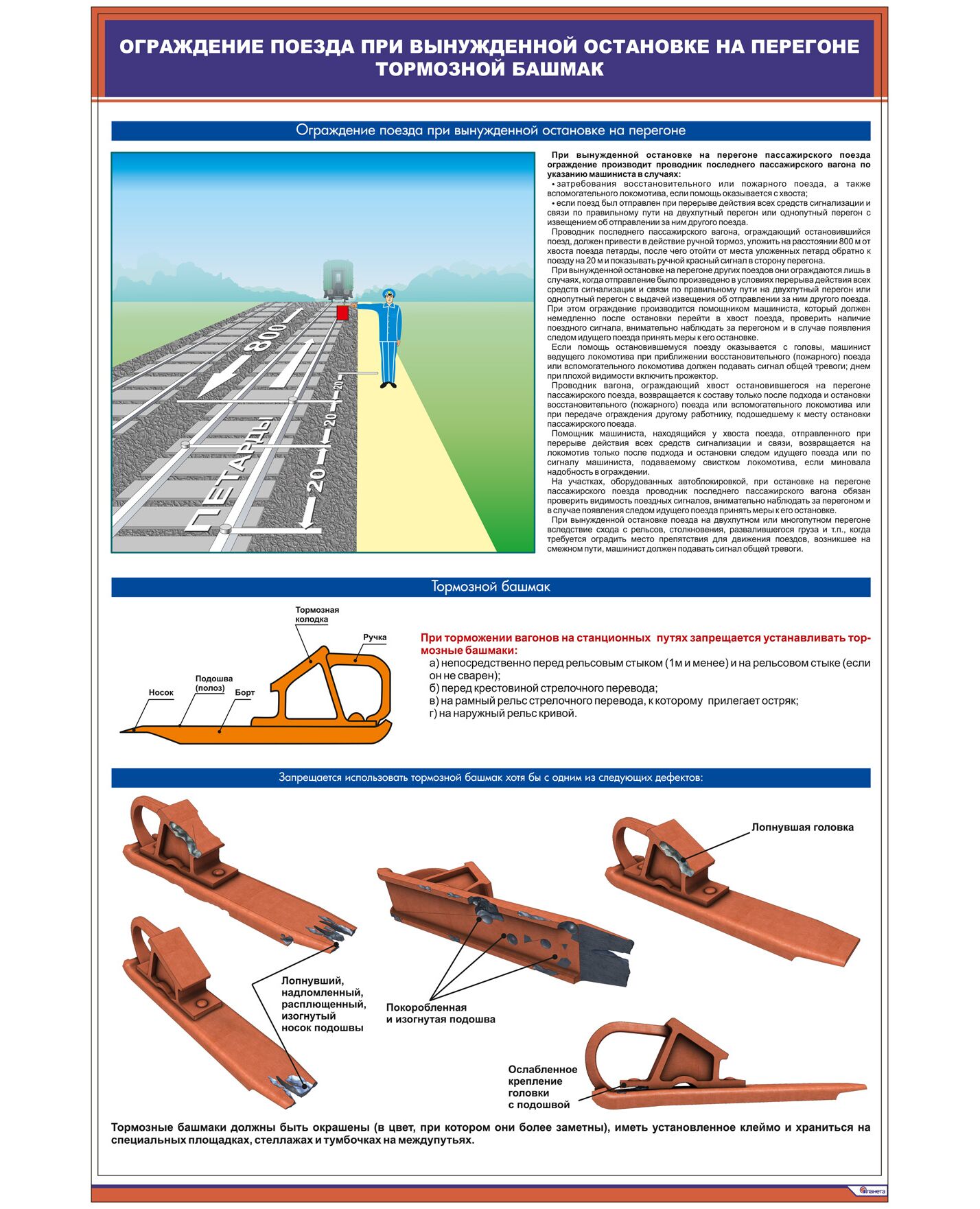Плакат: Ограждение поезда при вынужденной остановке на перегоне. Тормозной башмак (600 х 900 мм, ламинированный, с пластиковым профилем и стальным крючком)