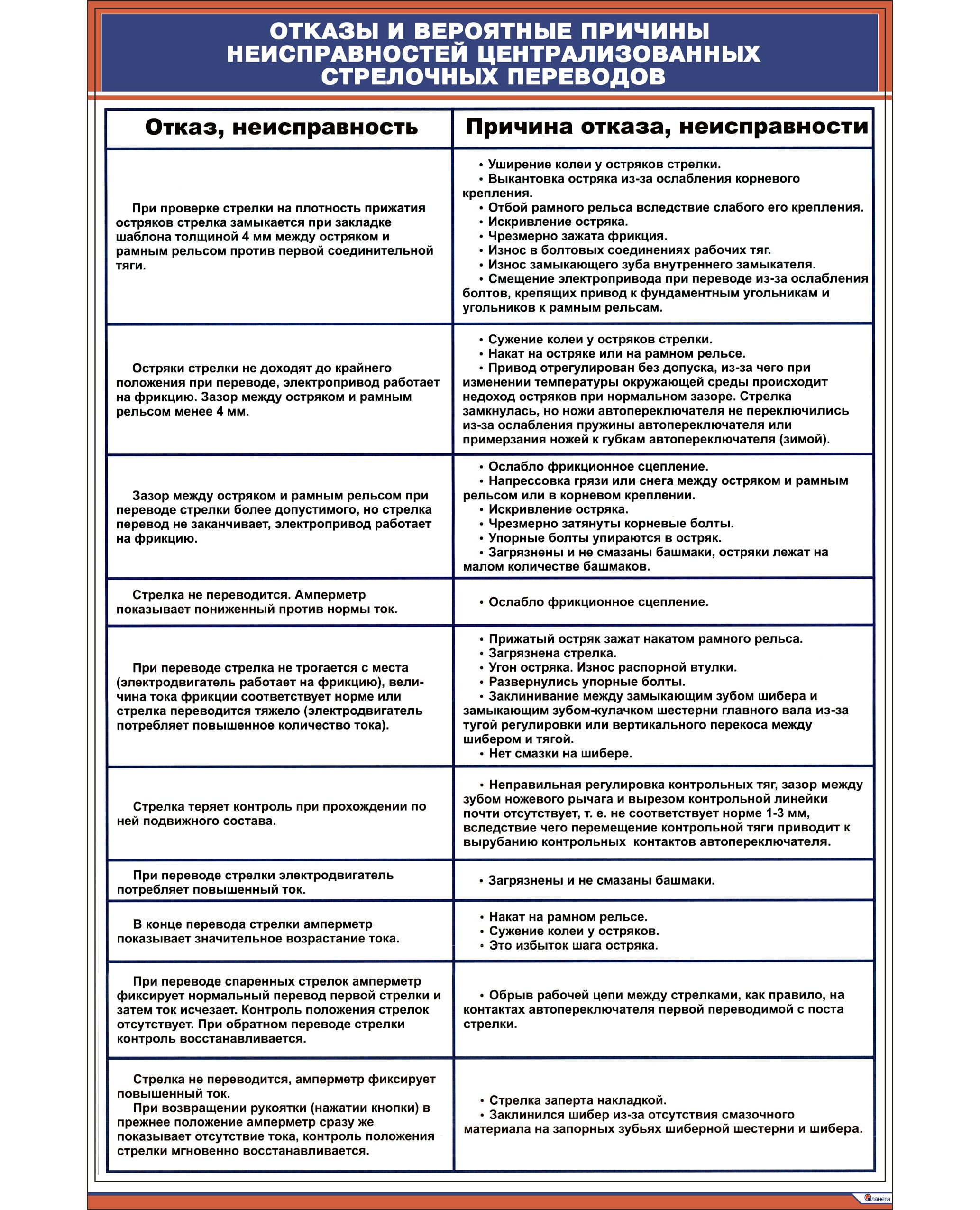 Плакат: Отказы и вероятные причины неисправностей централизованных стрелочных переводов (600 х 900 мм, ламинированный, с пластиковым профилем и стальным крючком)