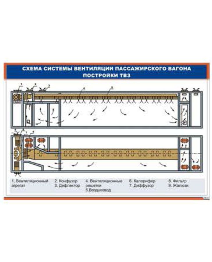 Схема системы вентиляции пассажирского вагона постройки ТВЗ (900 х 600 мм, ламинированный, с пластиковым профилем и стальным крючком)
