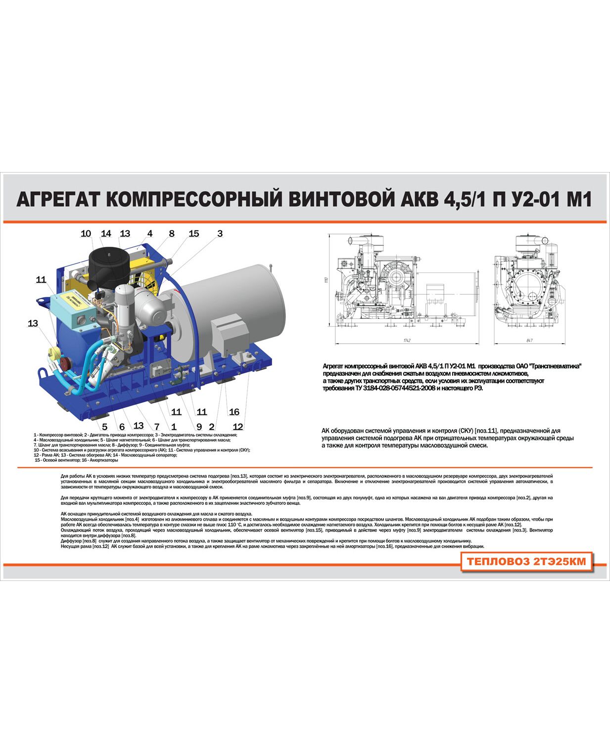 Плакат: Агрегат компрессорный винтовой АКВ 4,5/1 П У2-01 М1 (900 х 600 мм, ламинированный с пластиковым профилем и крючком)