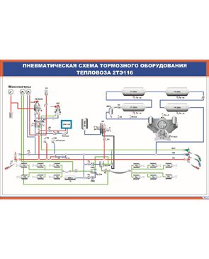 Плакат: Пневматическая схема тормозного оборудования тепловоза 2ТЭ116 (900 х 600 мм, ламинированный, с пластиковым профилем и стальным крючком)