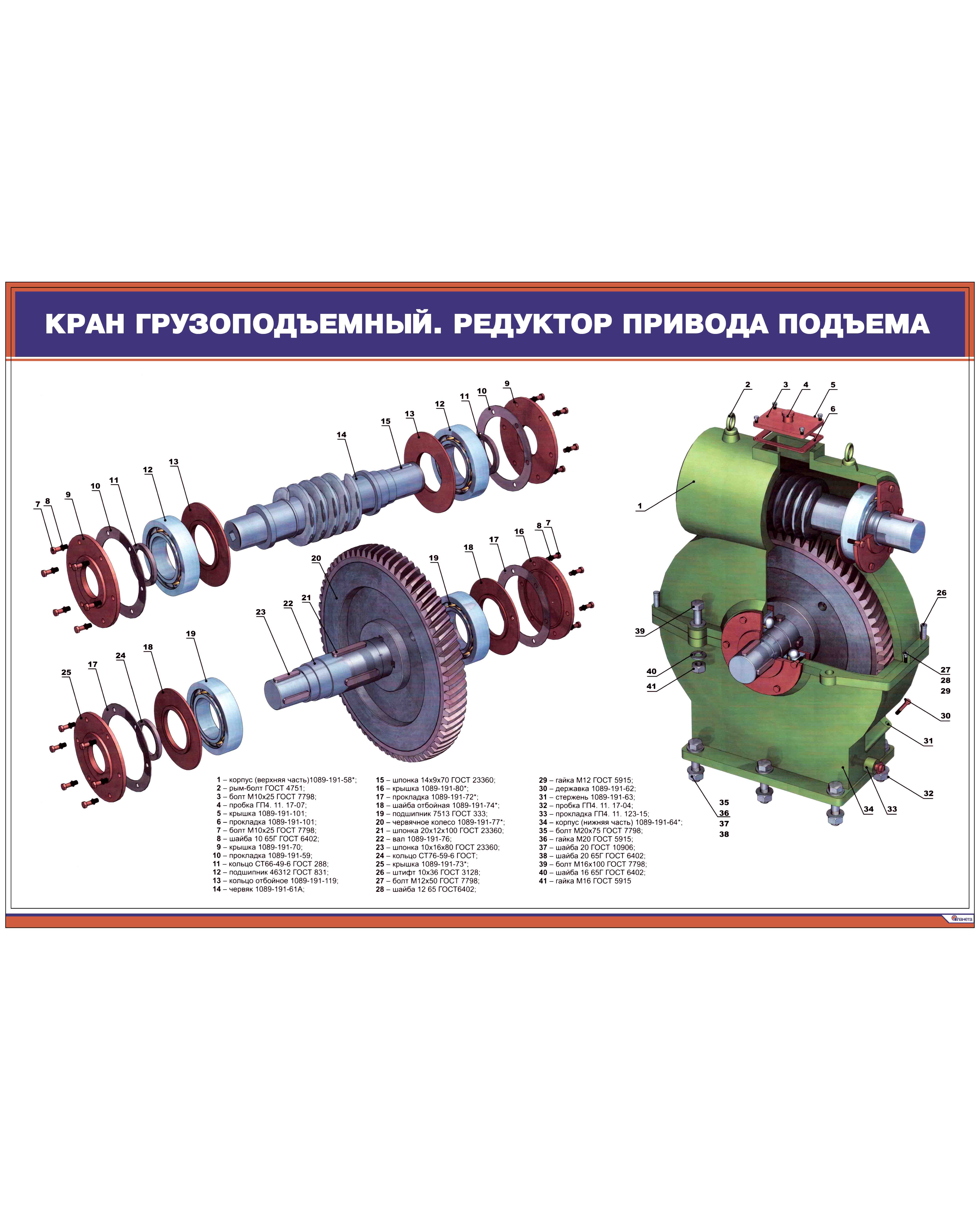 Плакат: Кран грузоподъемный. Редуктор привода подъема (900 х 600 мм, ламинированный, с пластиковым профилем и крючком)
