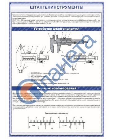 Плакат: Штангенинструменты. Устройство и порядок использования штангенциркуля (600 х 900 мм, ламинированный, с пластиковым профилем и крючком)